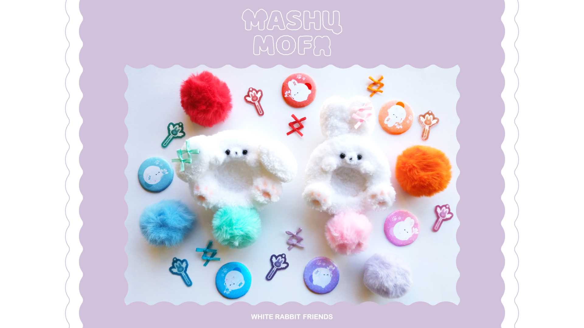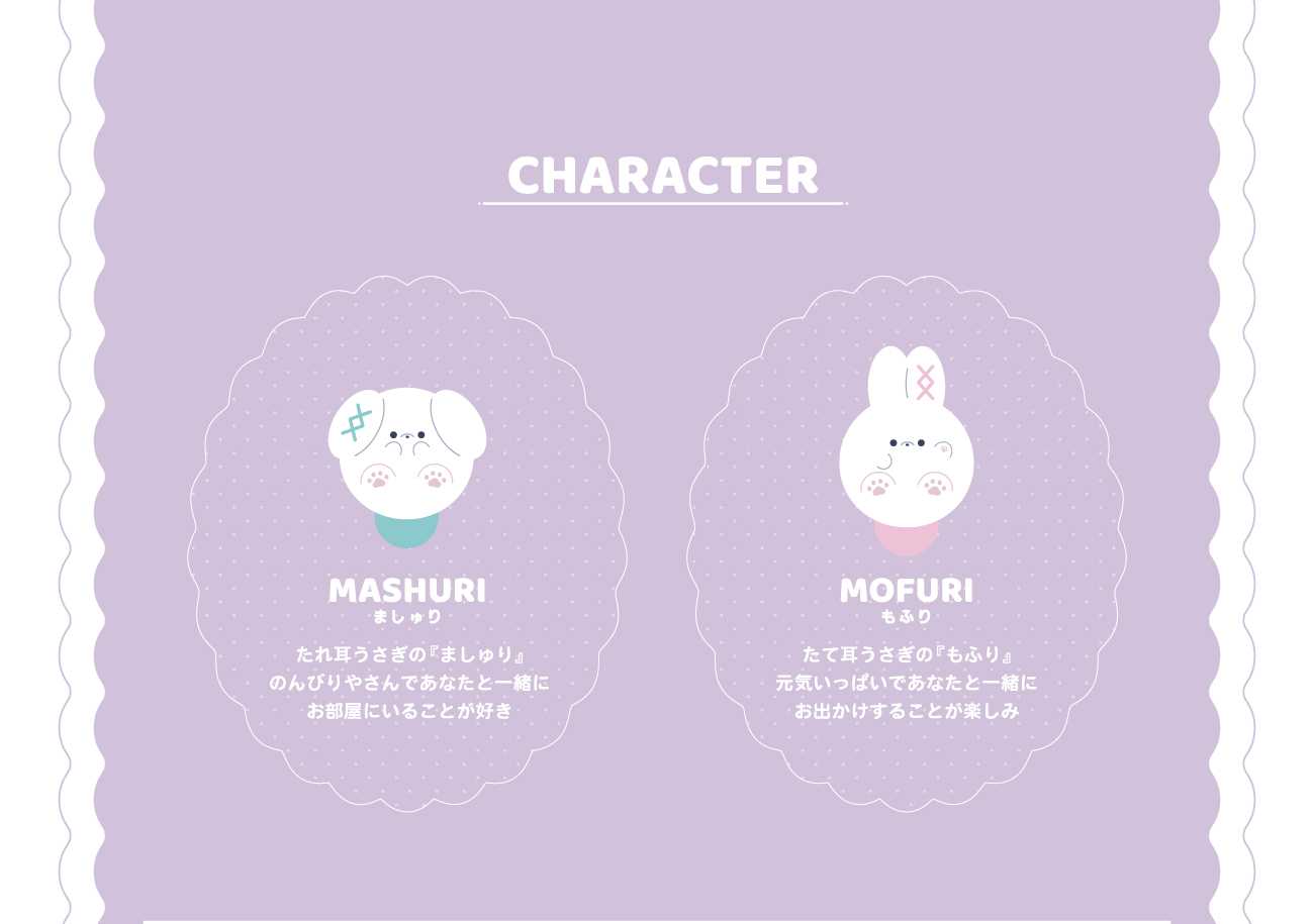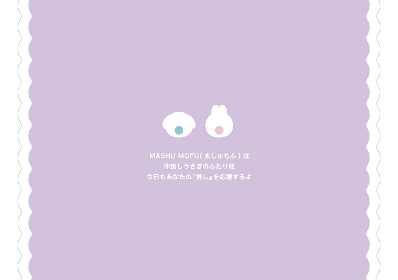 本作品は現代の日本に根付く「可愛い文化」や「推し活文化」を反映した、オリジナルキャラクターとグッズです。かわいくてゆるい2匹のうさぎのキャラクター MASHU MOFU(ましゅもふ)がユーザーの推し活にそっと寄り添い、応援します。