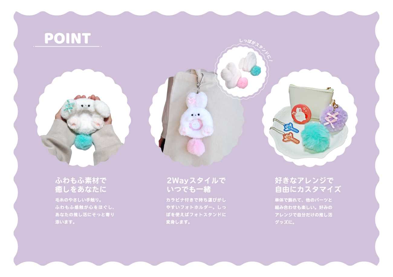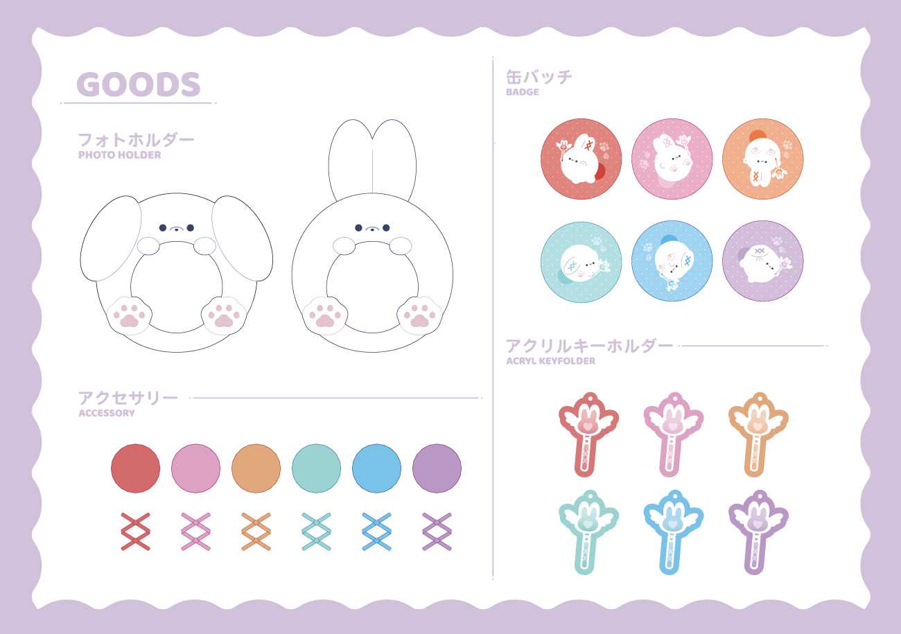 本作品のグッズの種類はフォトホルダー・缶バッジ・アクリルキーホルダー・リボンとしっぽのアクセサリーパーツです。単体で使用したり、複数を組み合わせたり、カスタマイズ性が高いものを意識しました。カスタマイズ性の高さは推し活応援グッズの魅力であり、ユーザーが推し色やアクセサリーを組み合わせて選ぶことで、ひとりひとりの「好き」や「多様性」を表現できます。