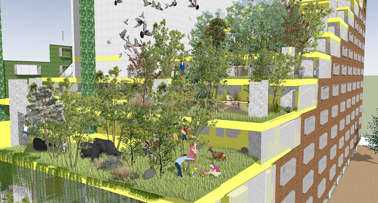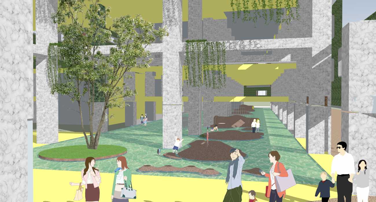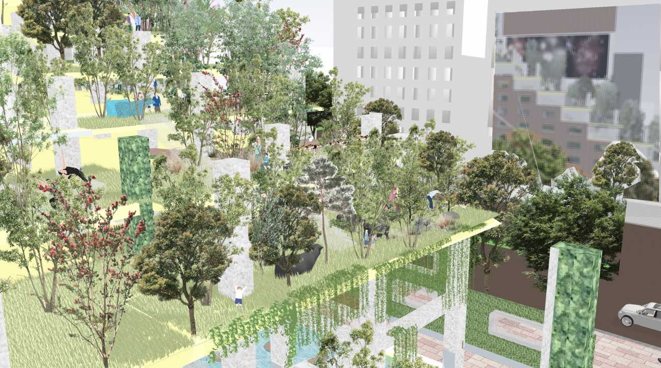 都市の緑の中に生まれる多様なコミュニティ(SKETCHUPにて制作)