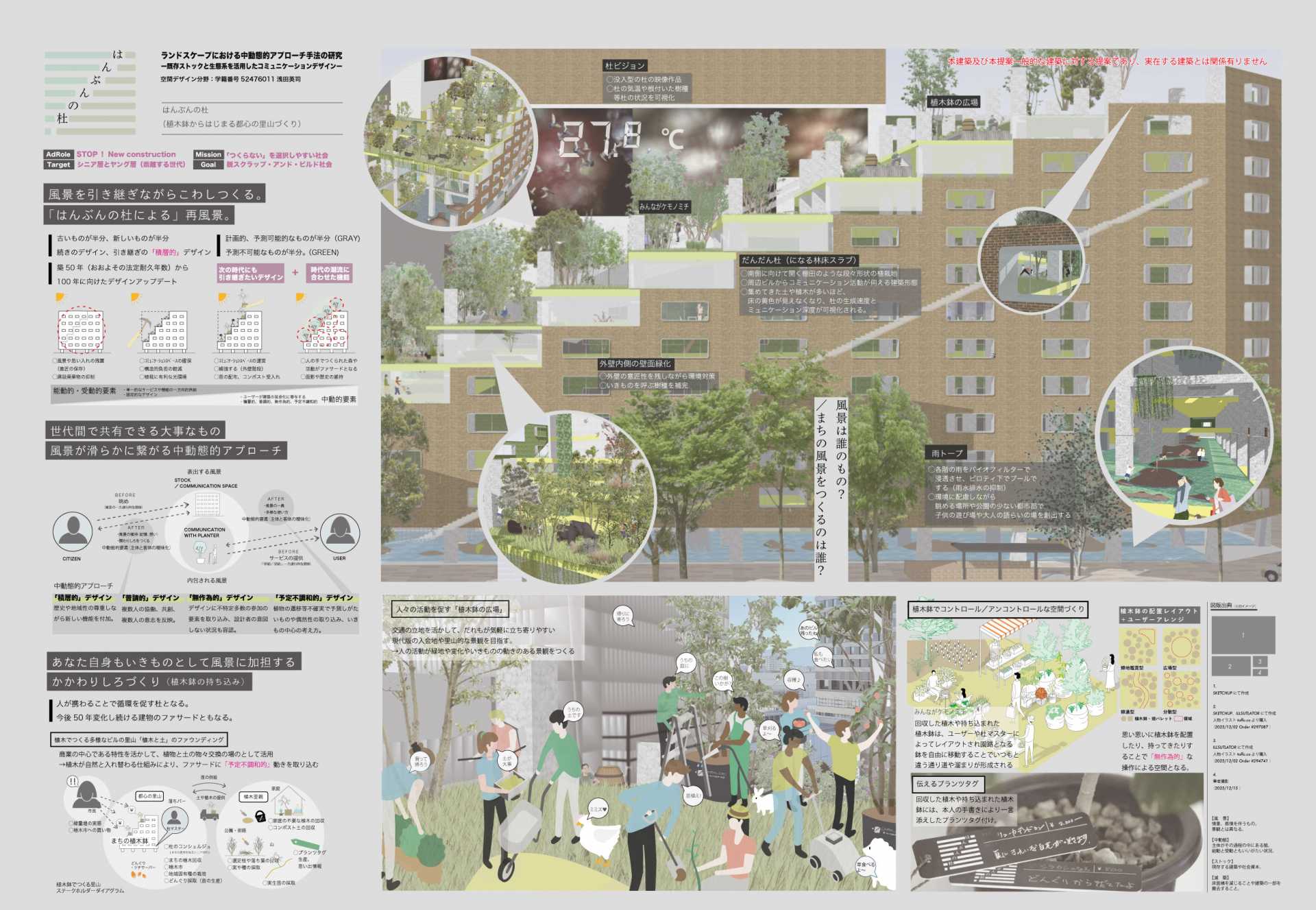 今取り壊されている高度経済成長期に生まれた建築は単一的な機能、用途のものが多く、ユーザーとの関係性が一方向(建築が供給、ユーザーが受給)になっていることから、風景を介して双方向的な関係性に転換するための「かかわりしろ」づくりを、中動態的アプローチ(「積層的デザイン」「無作為的デザイン」「普請的デザイン」「予定不調和的」デザイン)により実現し、人々の活動が風景として意識されることを目指します。