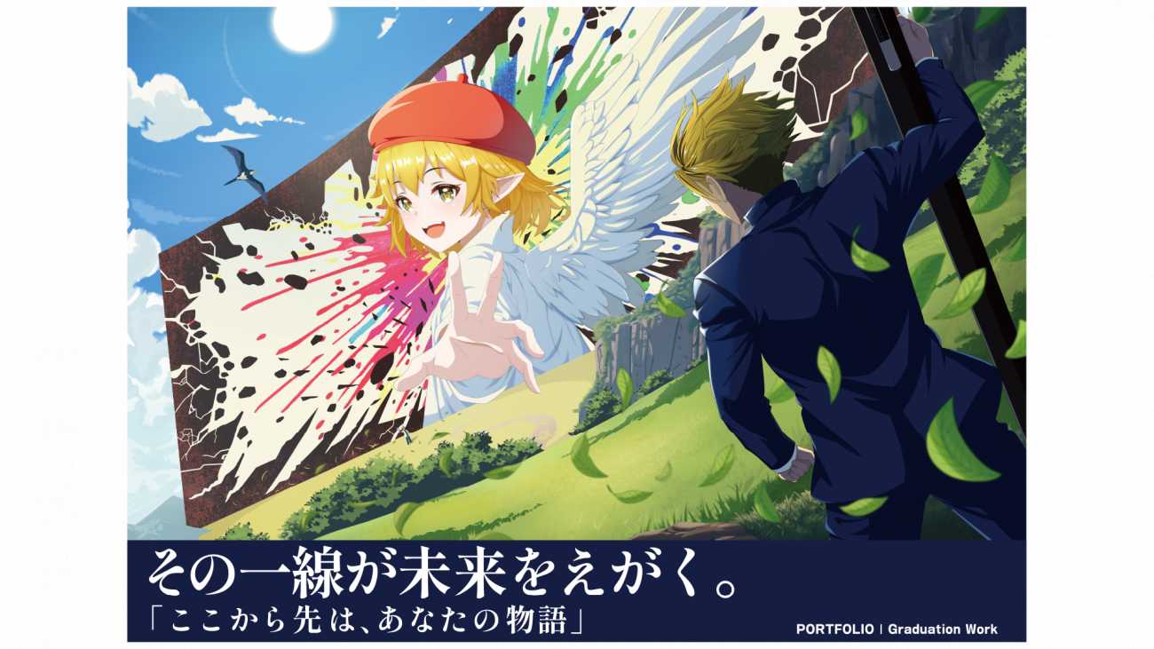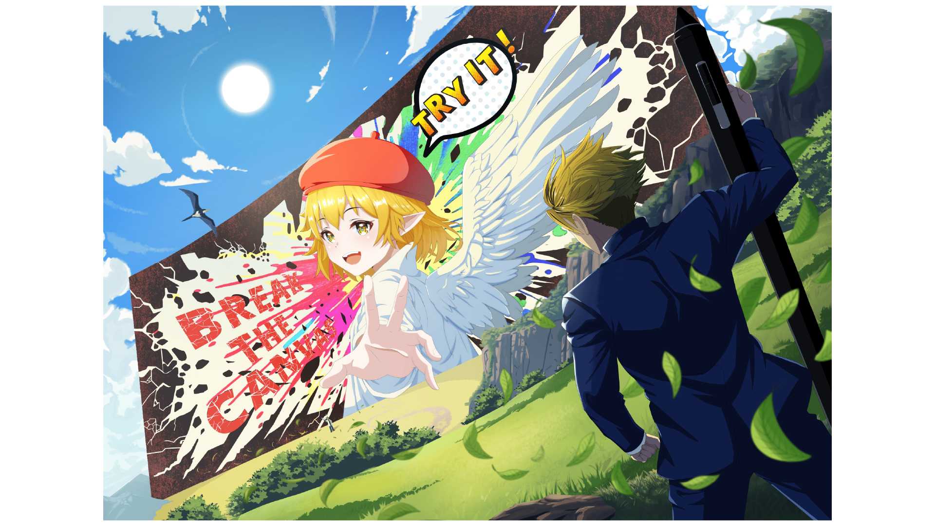 画面は、手前にこれから描き始める人を配置し、奥に大きなキャンバスと翼を持つキャラクター、そしてキャンバスのふもとには、ペンを携えた教育者の姿を描いています。手前のキャラクターは決意と不安や高揚が混じる「出発前」の空気をまとい、斜めの構図と三分割構図によって、視線が自然に奥のキャンバスへと導かれるよう設計しました。キャンバスは「未来」や「まだ描かれていない可能性」の象徴であり、そこを突き破るように現れる翼を持ったキャラクターの存在は、内側から湧き上がる創造性や、殻を破る勇気を表しています。ペンを持つ教育者は、答えを与える存在ではなく、冒険に同行し、背中を押し、成長を見守る存在。描くことは孤独な作業にも見えますが、本作では「誰かの応援や関わりが、最初の一歩を強くする」という視点も込めています。