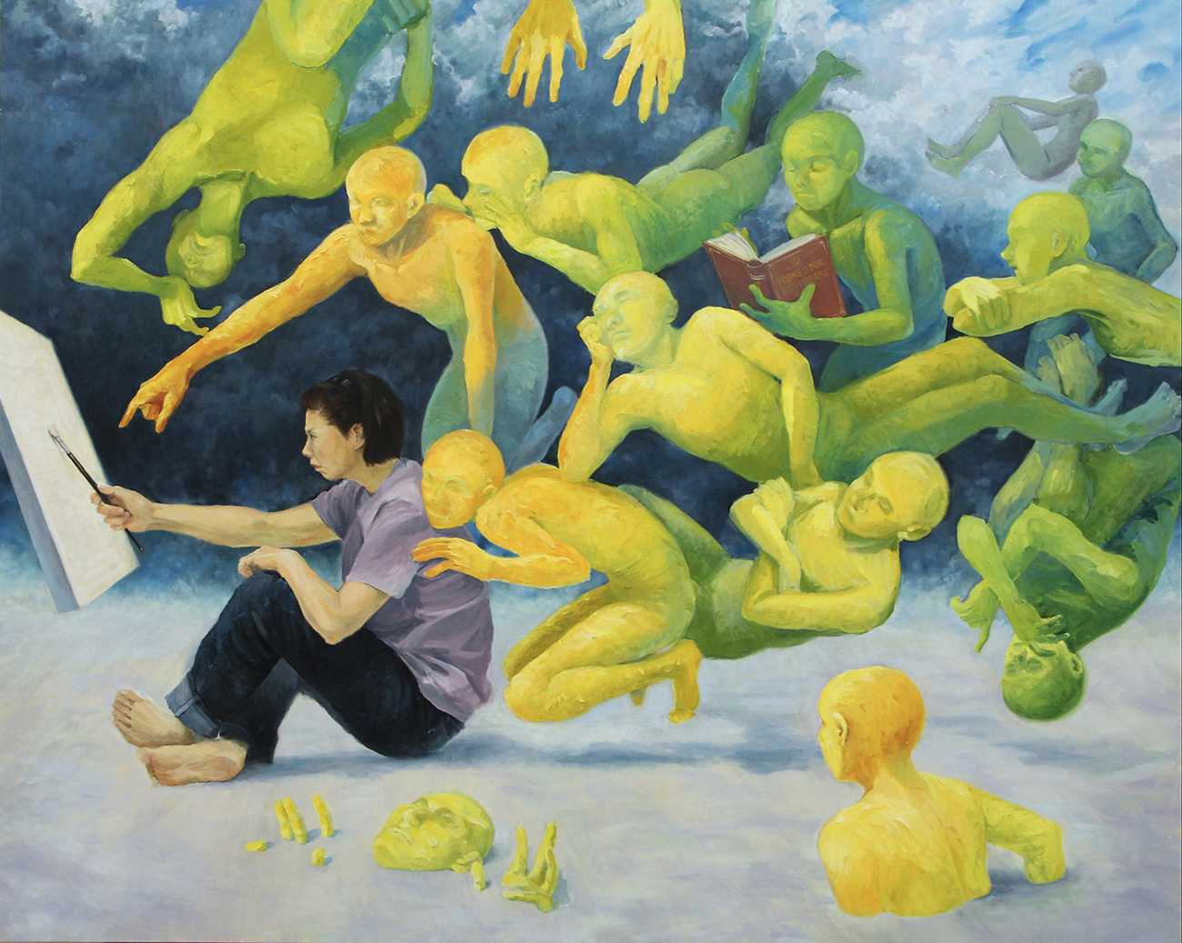 2作目の「我が脳内会議」は、絵を描いている時の自分の心中のイメージである。絵を描く時、自分の心中では複数のイマジナリーな自分達と共に会議をしながら描く。このイメージを、自画像と自分の思考のそれぞれを複数の粘土人形で表現し魚の群れのように自画像の背後に描いた。