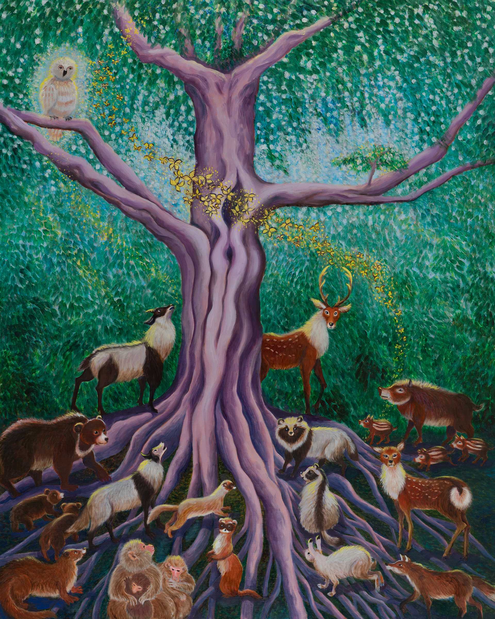 「ヤツルギ神社(異世界ポータル)」は、大樹の陰がつくる薄闇に沈む、別世界への入り口となる鎮守の杜(もり)と神社を描いた。自宅近所の八剱神社をモデルにした空想世界である。彩色は、木々による森の暗さを演出するために、プルシャンブルーの青みを強調した緑色を多用した。鳥居には立体感が出るように光源は順光と背景の照り返しの二つを設定し、画面の奥行をだしつつ、やや不自然な光源によって異世界の雰囲気を出した。