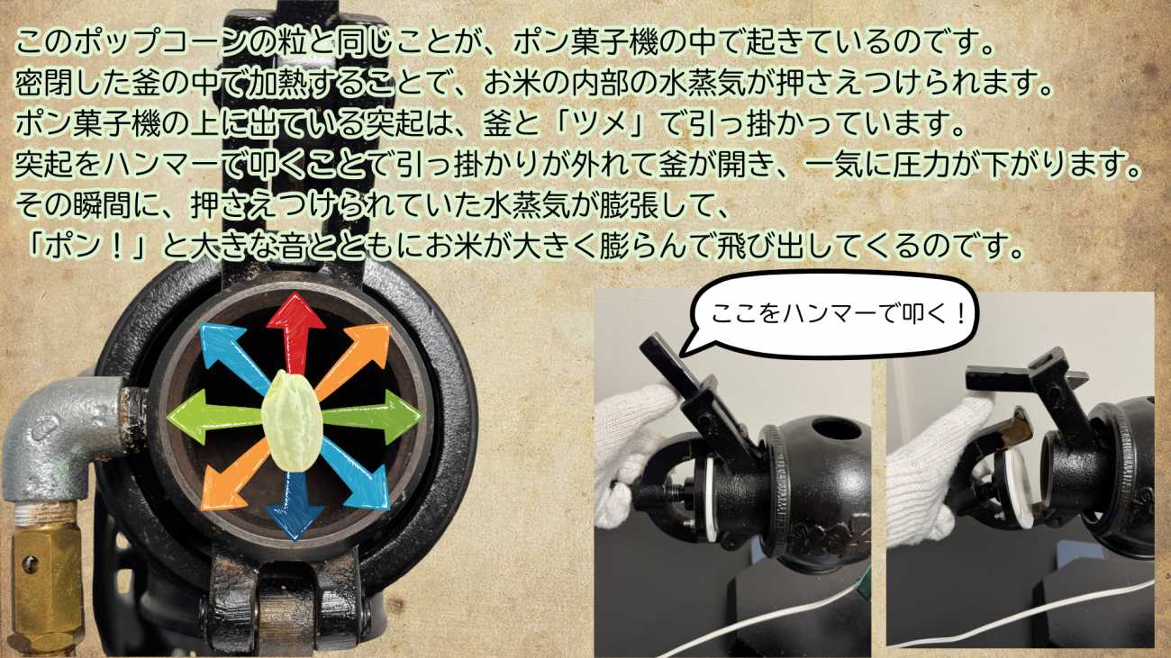というのも、ハンマーで叩くとポン!(というよりドン!)という爆音とともに、一瞬にして膨らんだポン菓子が飛び出してくるのです。