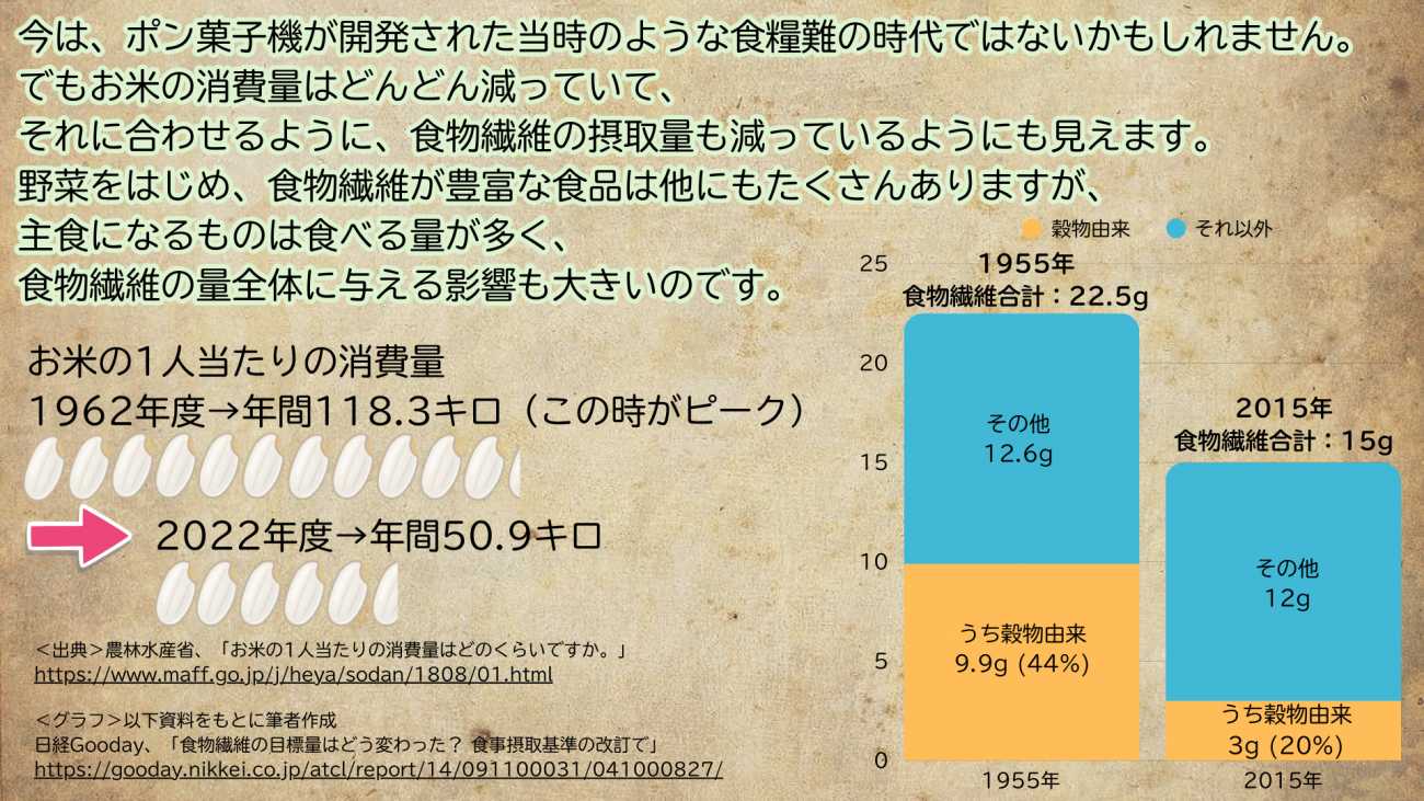その一方でお米の消費量はどんどん減っていて、さらに食物繊維の摂取量もそれに合わせるように減っています。