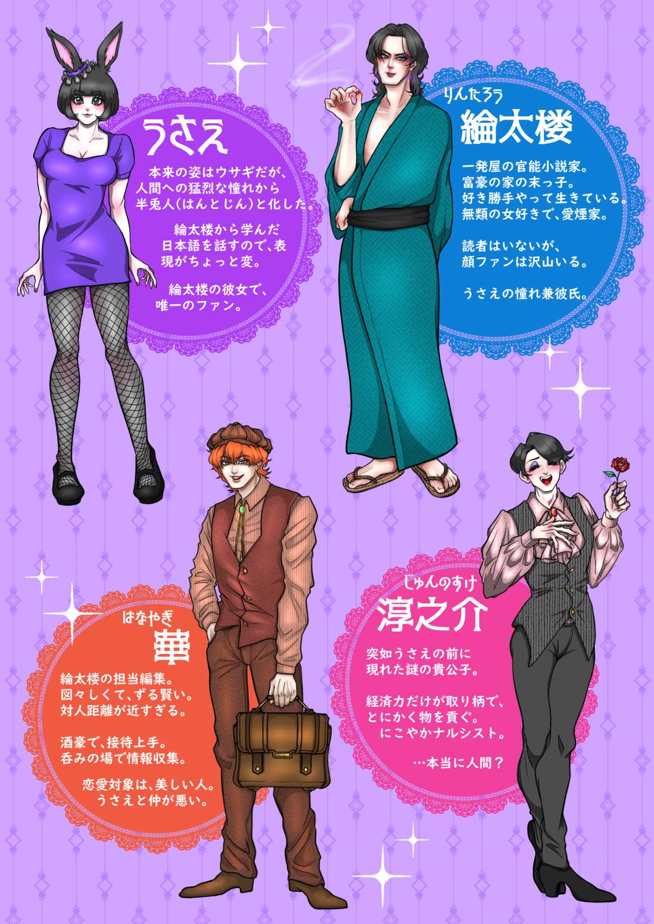 「時代錯誤レコード」シリーズにおけるメインキャラクターの一人・半兎人「うさえ」を中心に、彼女を取り巻く三人の男性との、あんなこんな関係性を描いた昭和レトロな映像作品。