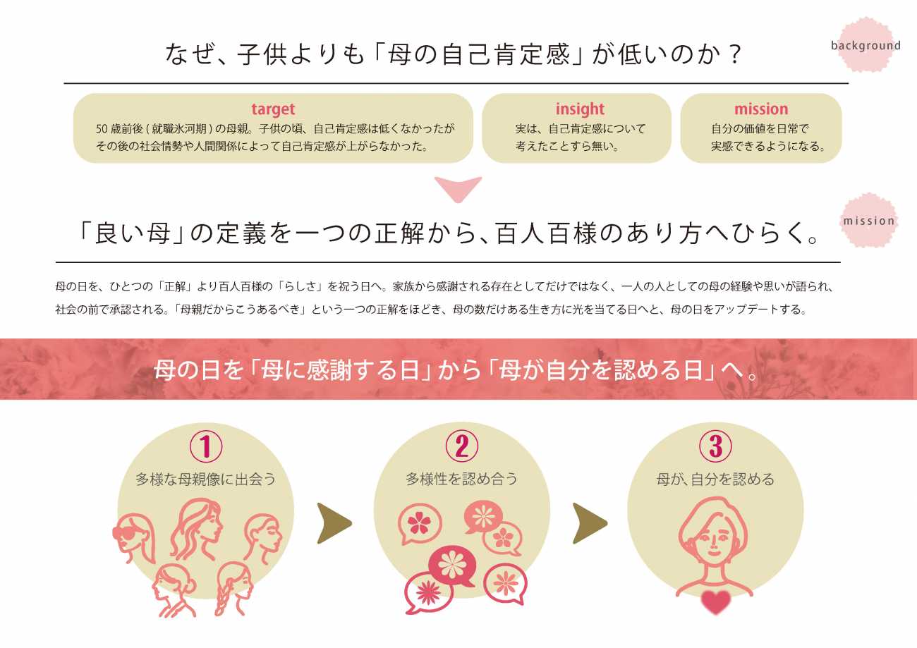 母の日を家庭内の行事から社会的な承認の場へ変え、母たちが自分の歩みを言葉にし、日常の中で自己を認める言葉の引き出しを増やしていく循環をつくります。