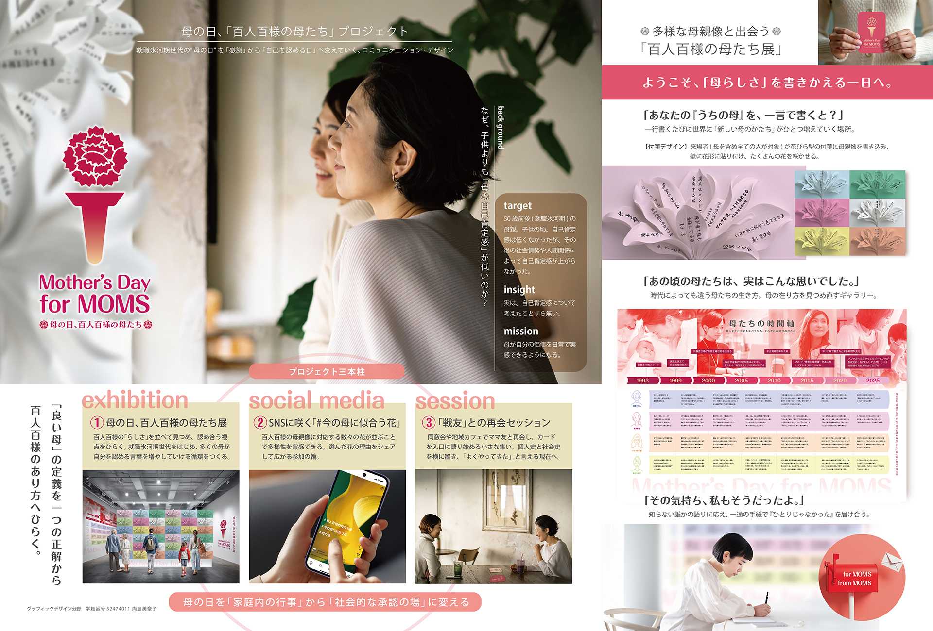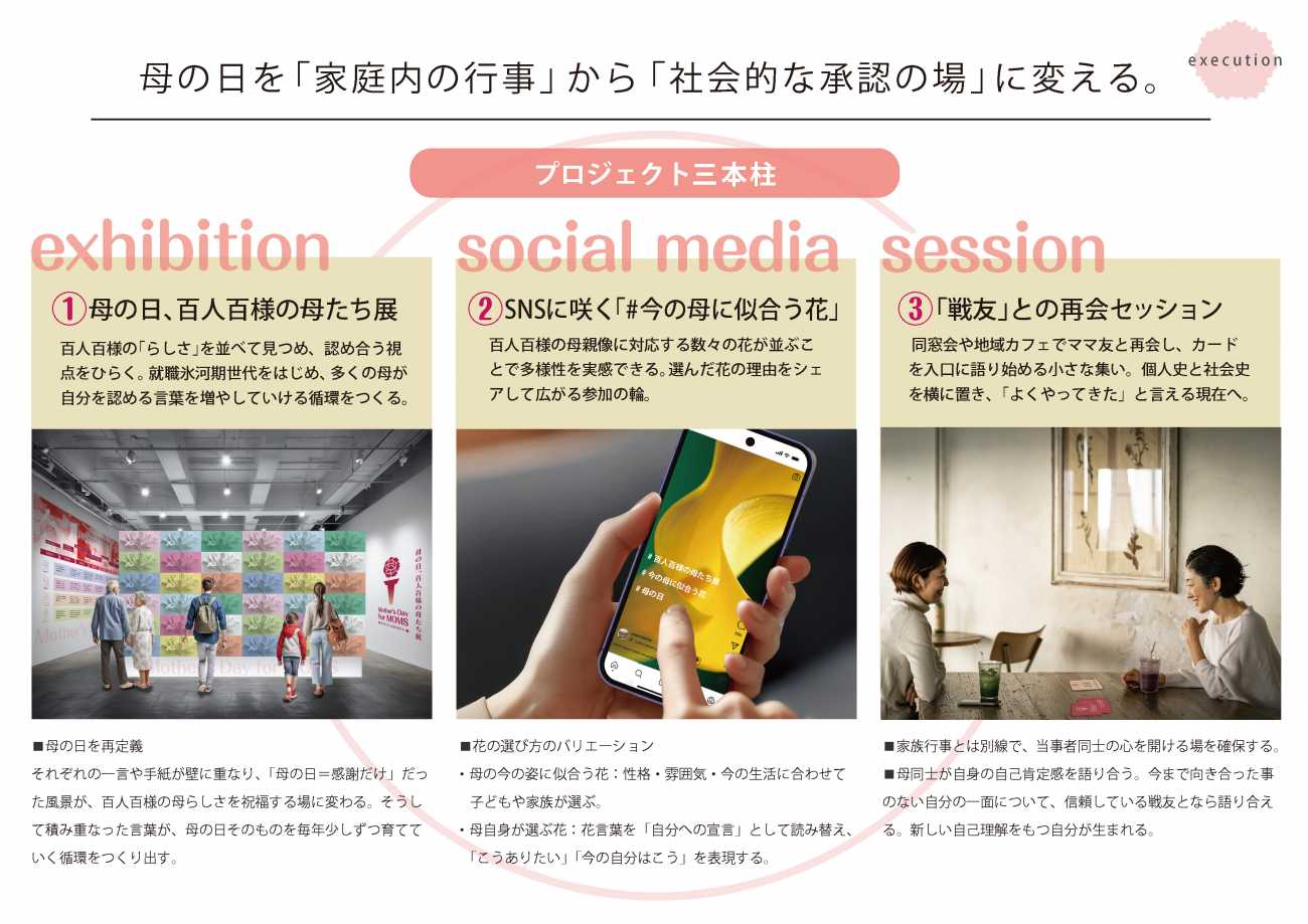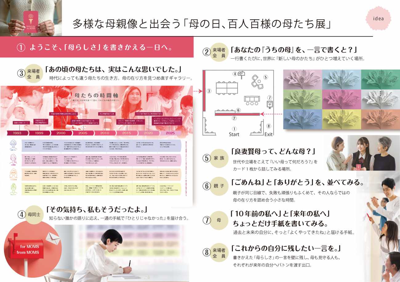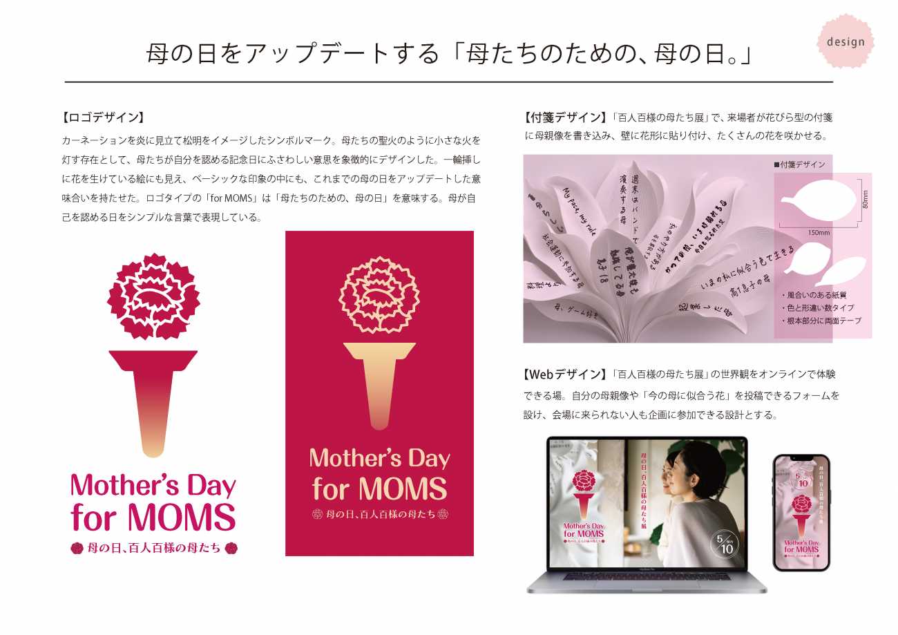 カーネーションを聖火に見立てたロゴマークには、母たちが自分自身を照らし、互いに灯を分かち合う願いを込めました。展示会・SNS・対話セッションの三本柱で構成し、小さな参加の積み重ねで承認を往復させます。来場者が花びら型の付箋に多様な母親像を書き込む参加型ボード、個人史と社会史を並べて「全部自分のせい」でも「全部時代のせい」でもないと理解できる年表、母から母への語り返しレターなど、安心して語り、受け止め合える仕掛けを用意しました。SNSでは「#今の母に似合う花」を通じてカーネーション一択から多様な選択へ。