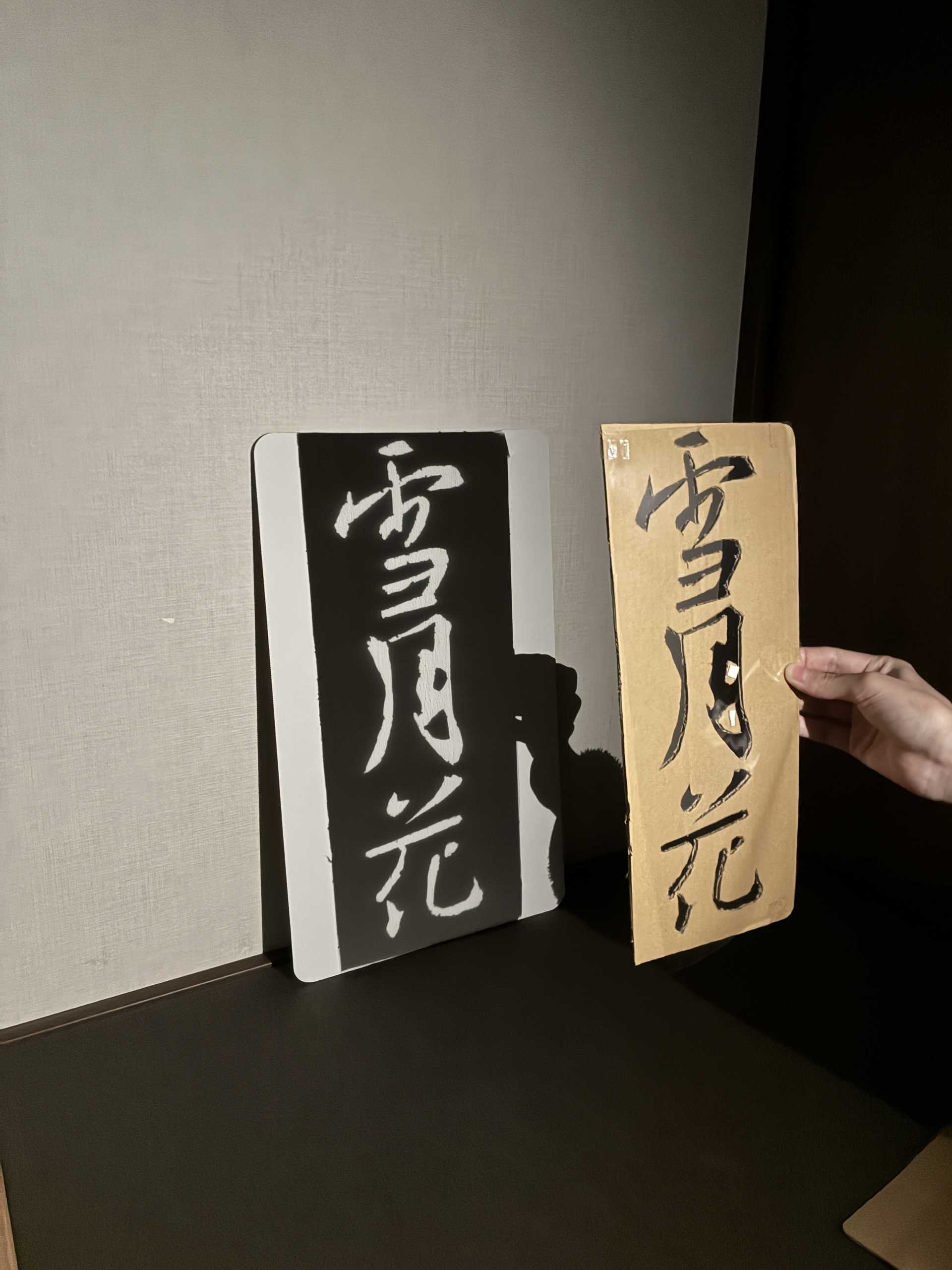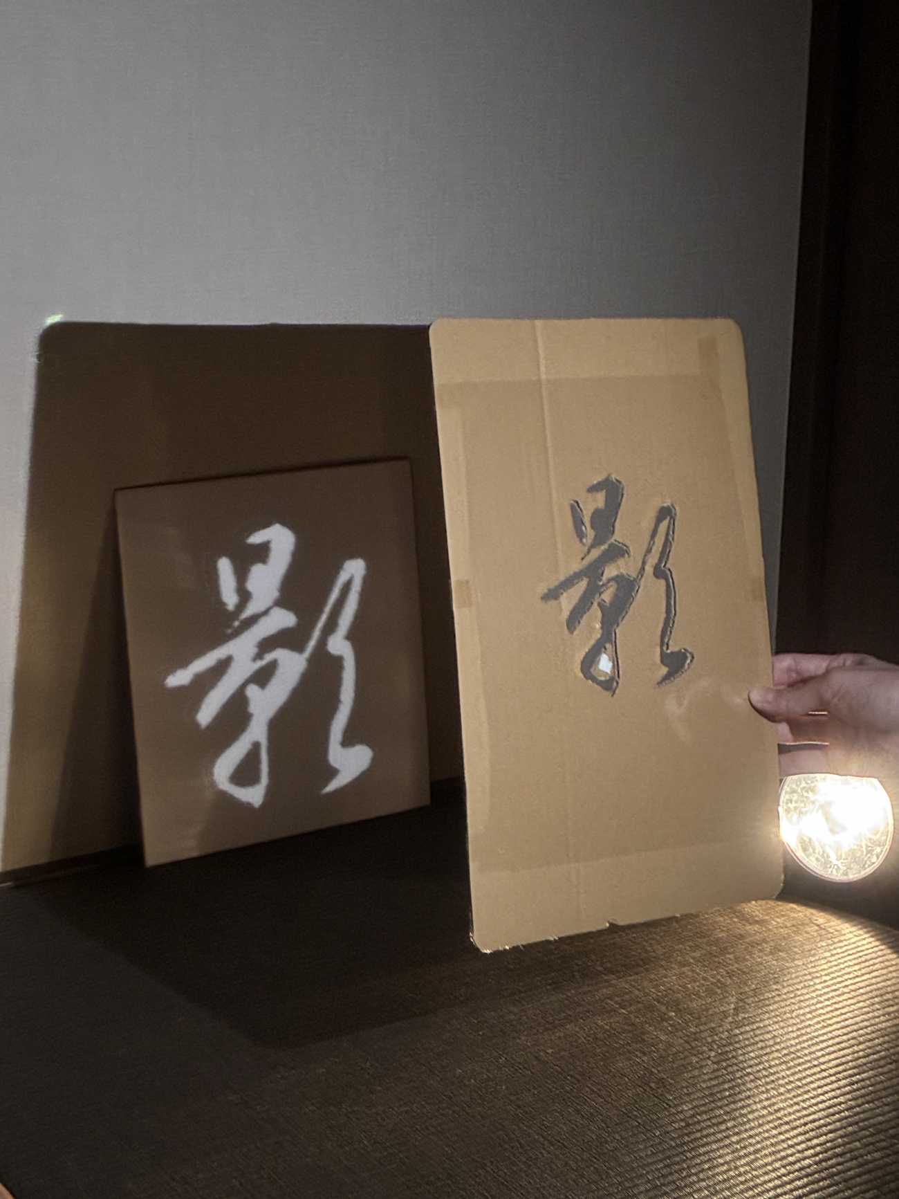 身近にあり安価で捨てられてしまうようなダンボールを素材としており、切り抜いた文字に光を通し、書を像として立ち上げる作品である。文字が物質そのものではなく、光と影によって可視化される作品にした。