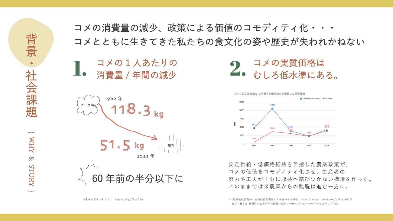 【1|背景・社会課題】米消費量は60年で半減。さらに、政策により価値と文化が伝わらず、コメ農業離れが進む要因になっています。