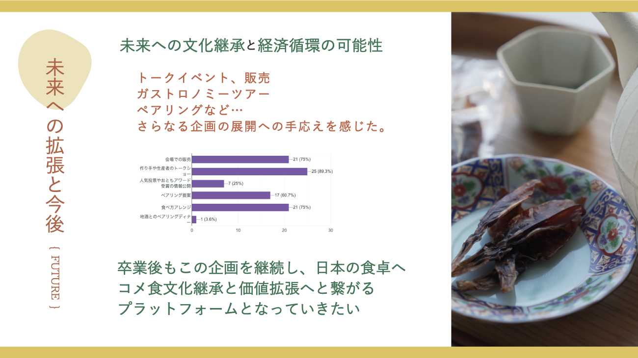 実食イベントでは高い満足度と購買意欲が確認され、体験が意識変容だけでなく行動へとつながることが示されました。本プロジェクトは、文化継承と経済循環を両立しうる可能性を提示する一歩になったと考えています。 卒業製作では終わらせずに、作り手・消費者・地域をつなぐ文化IPとして今後も継続していきたいと考えています。