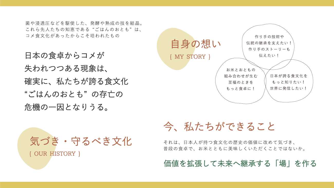 【2|守るべき文化と自身の想い】ごはんのおともは、発酵や熟成など先人の知恵の結晶。自分自身の日常の一部であり色の喜びである「おとも文化」を、未来へつなぐ場をつくりたいと考えました。