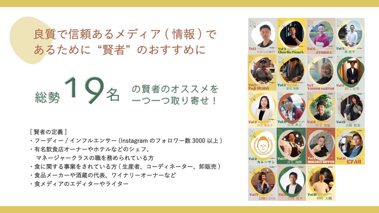 【6|賢者の推薦】 19名の食の賢者の推薦で信頼性を向上。良質な情報発信を実現しました。