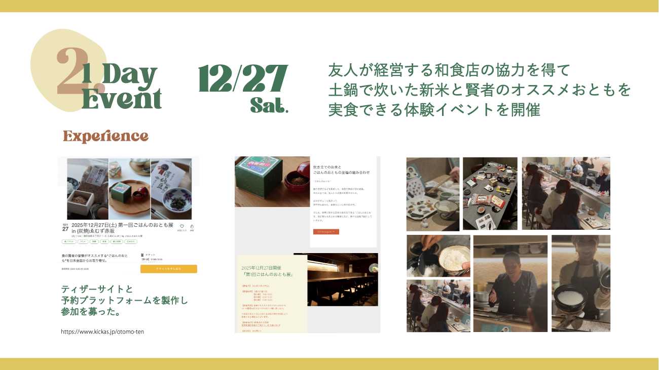 【7|実食イベント】 1日限定の体験イベントを開催し、当日は28名の参加者がありました。https://www.kickas.jp/otomo-ten