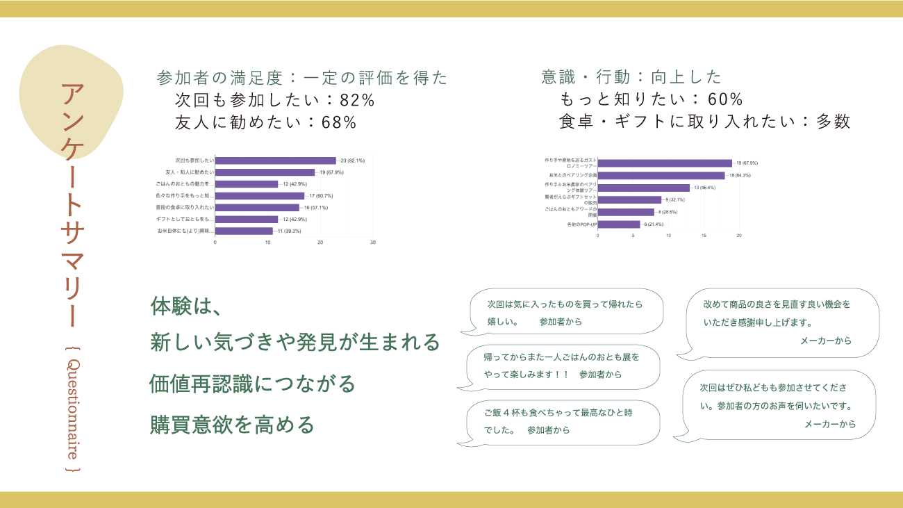 【9|アンケート結果と参加者の声】 高い満足度と購買意欲を確認。体験が価値再認識につながりました。