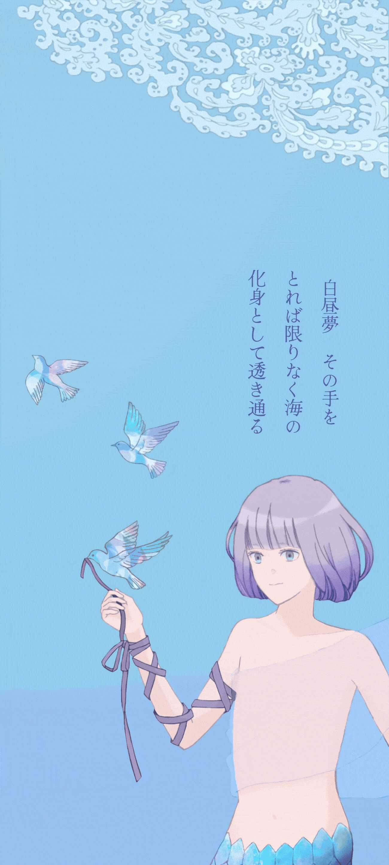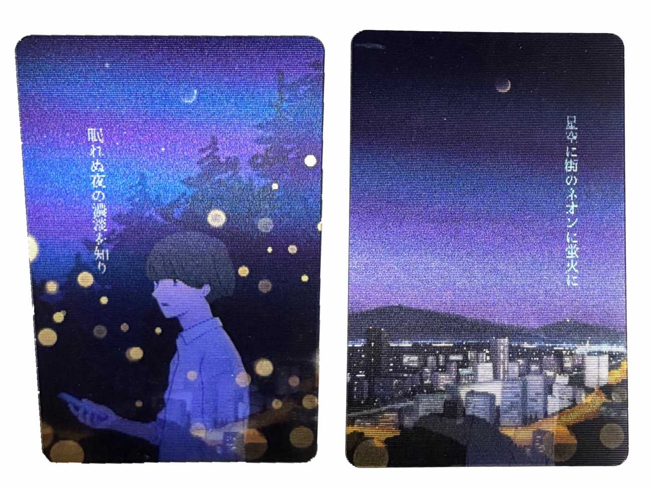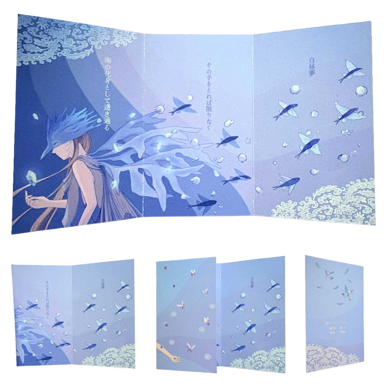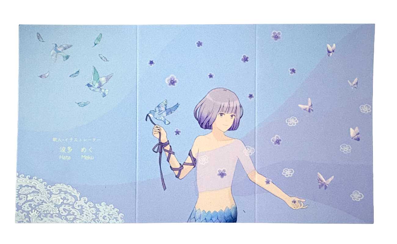 本制作では短歌とイラスト双方の世界観を楽しむことができる展示方法としてデジタル媒体とアナログ媒体で異なる形式を用いています。短歌の余情や場面の展開をイラストでどのように表現するか検討を重ね、余白とモチーフのバランスを特に意識してデザインしました。また、歌の内容に合わせた絵柄や媒体毎の見せ方に工夫を凝らしました。三つ折りカード・チェンジングカードは開く(動かす)ことで短歌とイラストが展開する仕様になっています。アニメーションはSNS等で発信する際に目を引きやすく、また動く壁紙に設定することを想定して制作しました。本作品を通じて短歌とイラスト表現それぞれの味わいや奥行を楽しんでもらえたら幸いです。