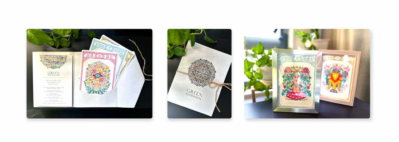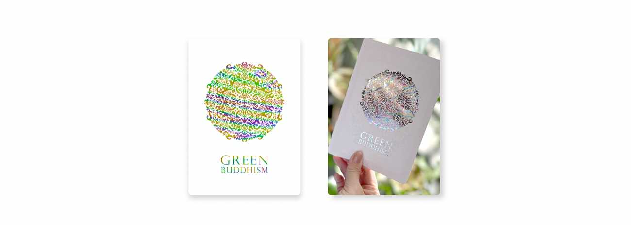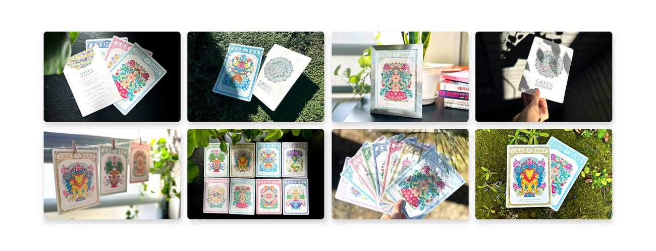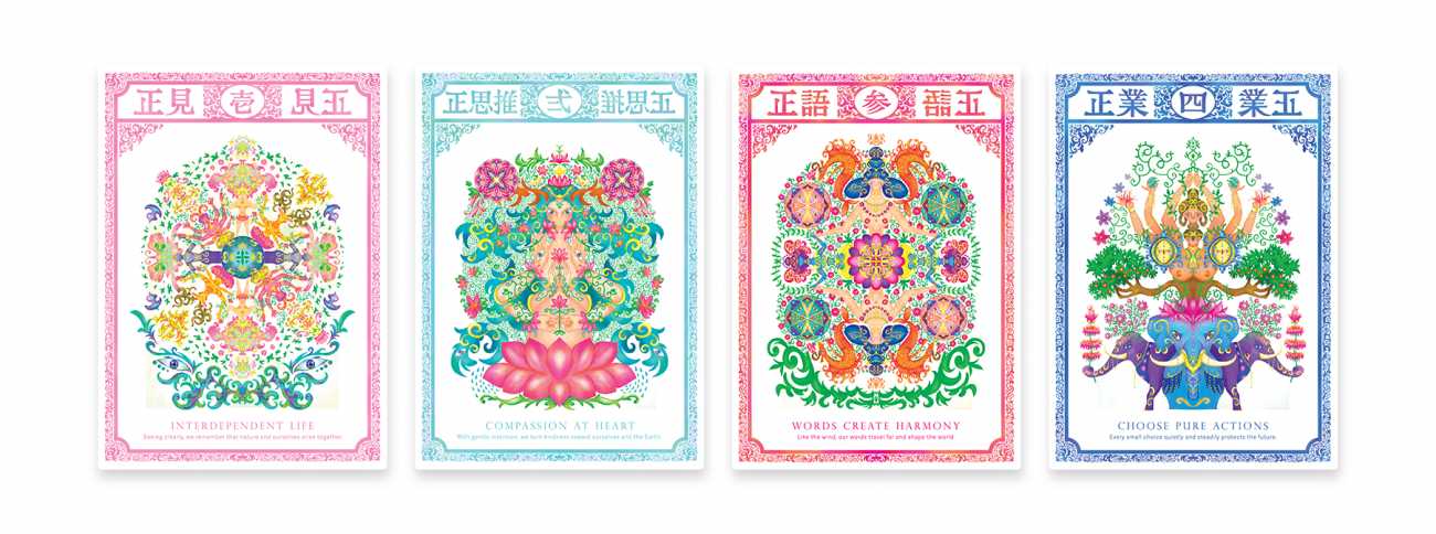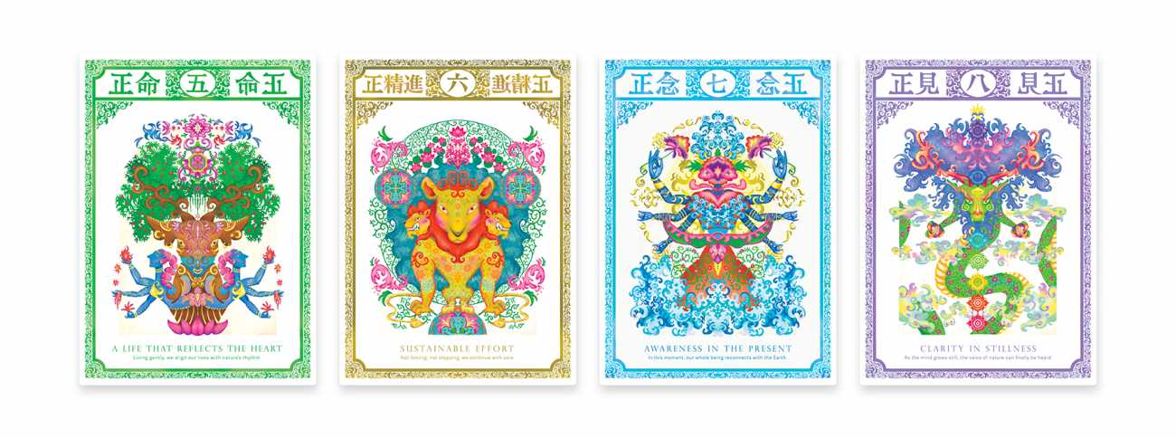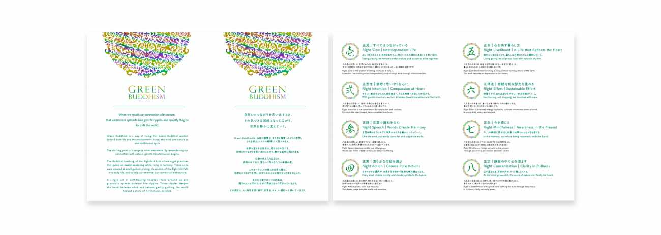 本作品では、仏教の実践の道である「八正道」をもとに、Green Buddhism の理念と重ね合わせたメッセージを添え、8つのカードを制作しています。それぞれのカードは、自然との共存を思い出すための小さな気づきとなり、日常の中で静かに実践できる指針として構成しました。