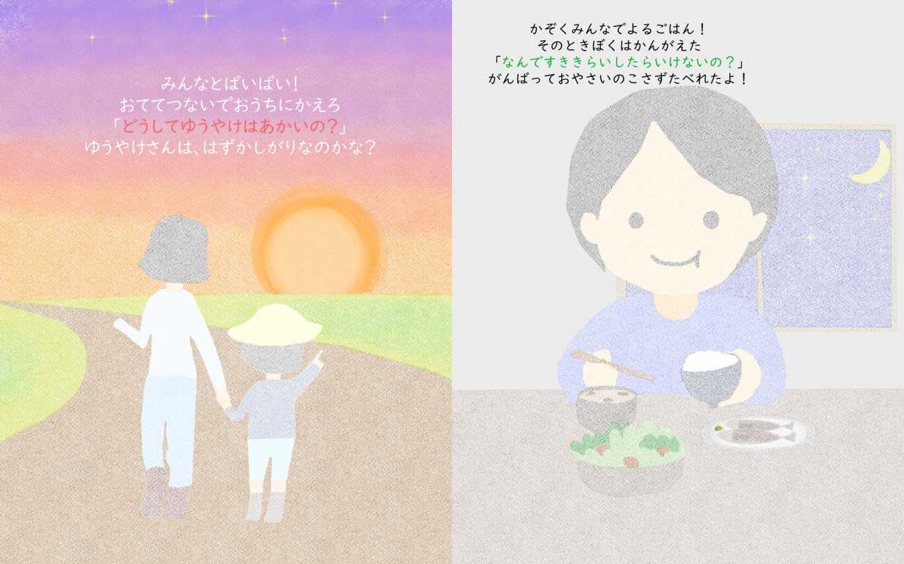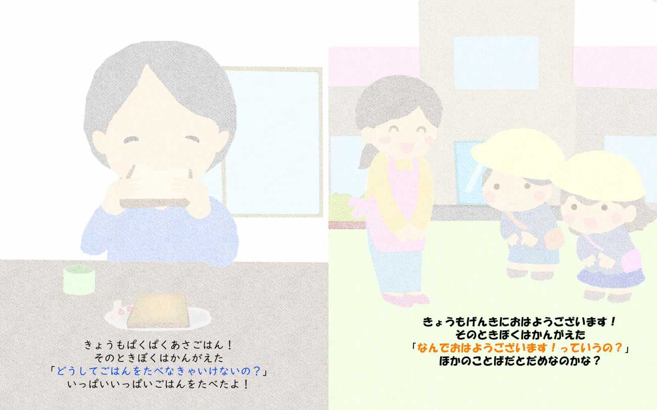 ターゲット層としては幼稚園・保育園児(3~6歳)であり、その世代が馴染みやすいよう、絵本風で題材の作成に取り組んだ。