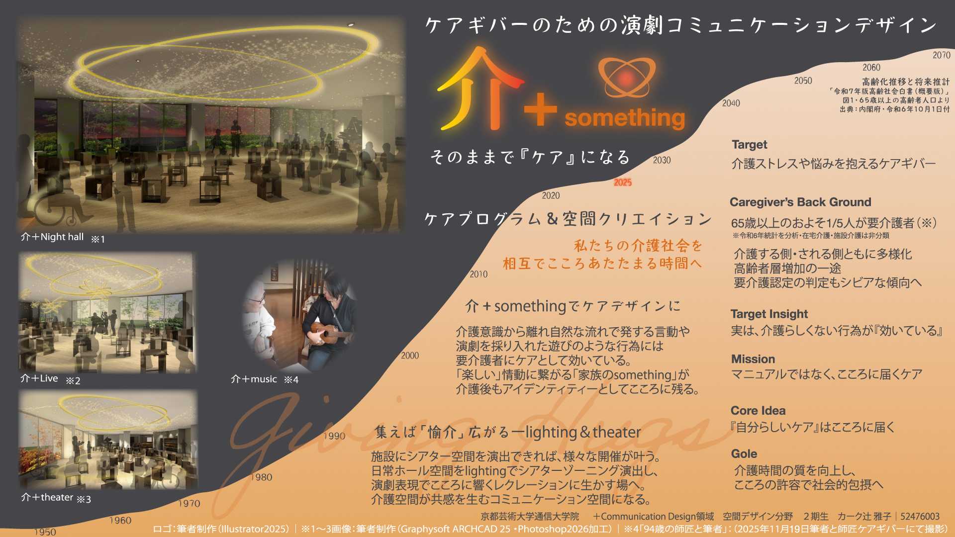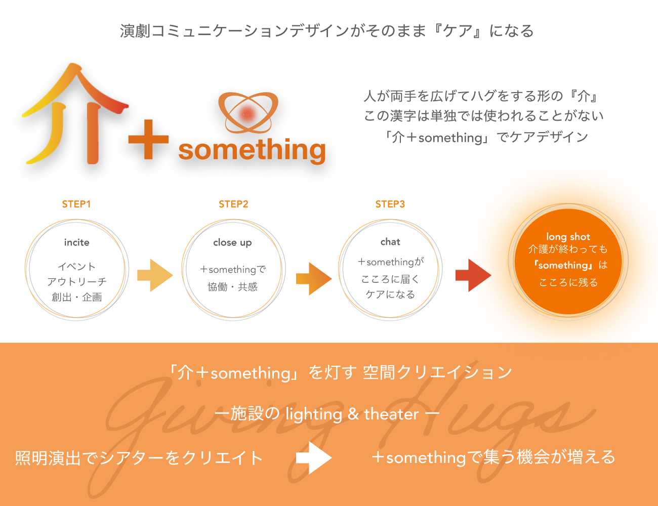 「介」の漢字の形の成り立ちからヒントを得て、介護テーマタイトルを「Giving Hugs」とした。プロジェクト「介+something」を企画し、ケアギバー自身が多様性あるアイデンティティーと共に、前向きなケアによる介護環境へ変容することを期待している。