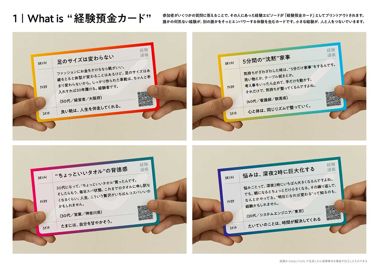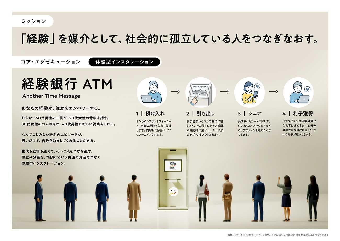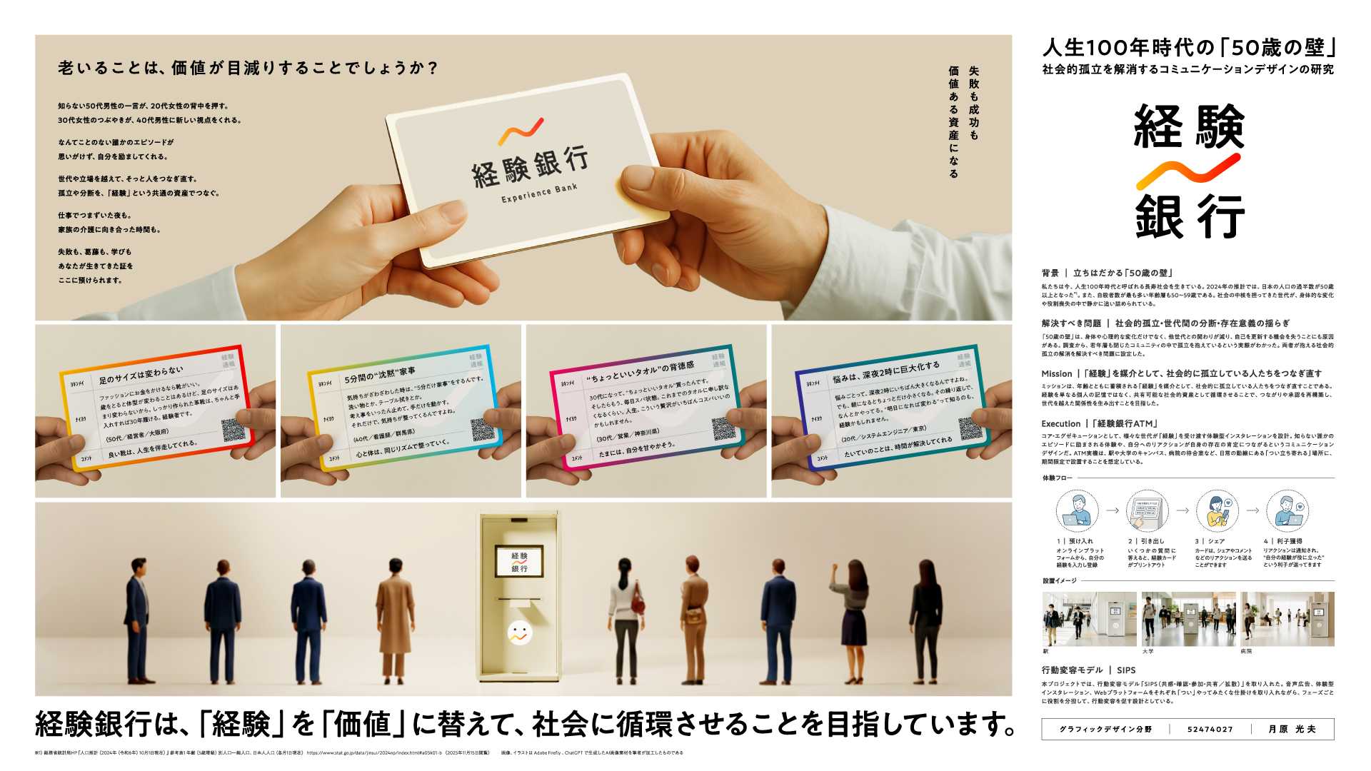この問いを起点にフィールドワークを重ね、50代をはじめとする社会的孤立を抱えやすい人たちが、もう一度社会と緩やかにつながり直すためのコミュニケーションデザイン「経験銀行」を構想しました。