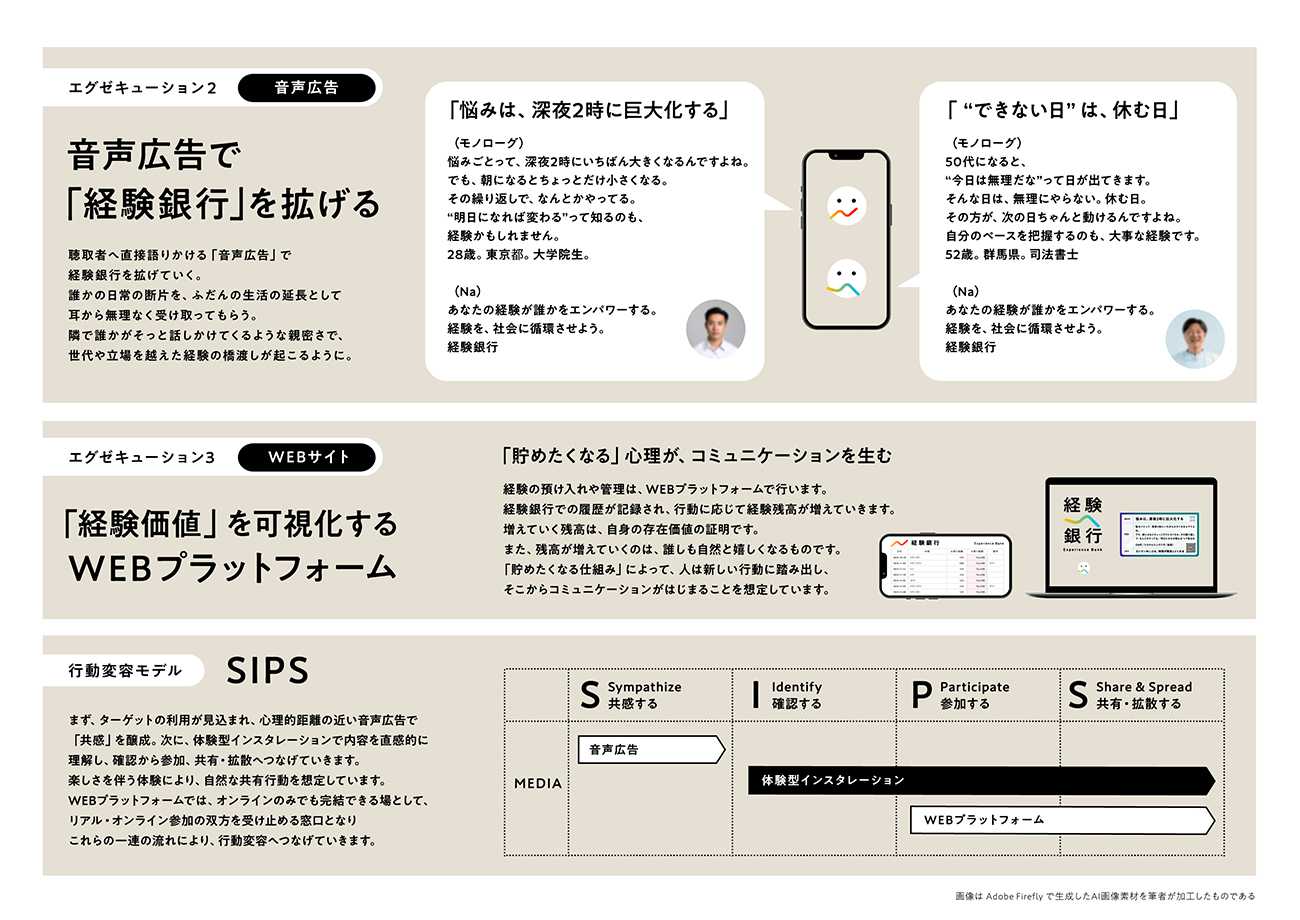 個人のなんてことない、ささやかな経験を「価値」として預け合う。体験型インスタレーションや音声広告、WEBプラットフォームなど、複数のメディアを横断したアウトプットとして設計しています。