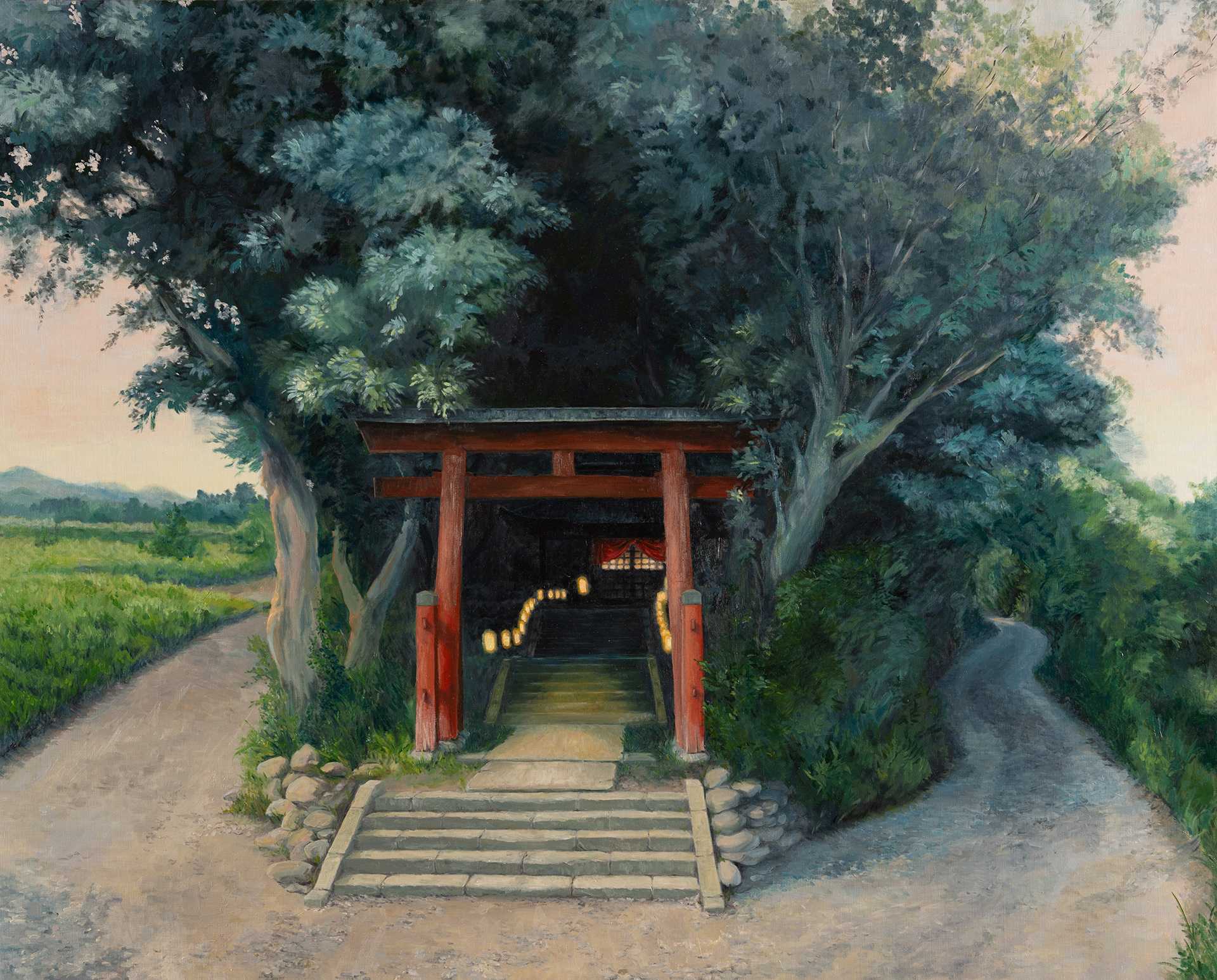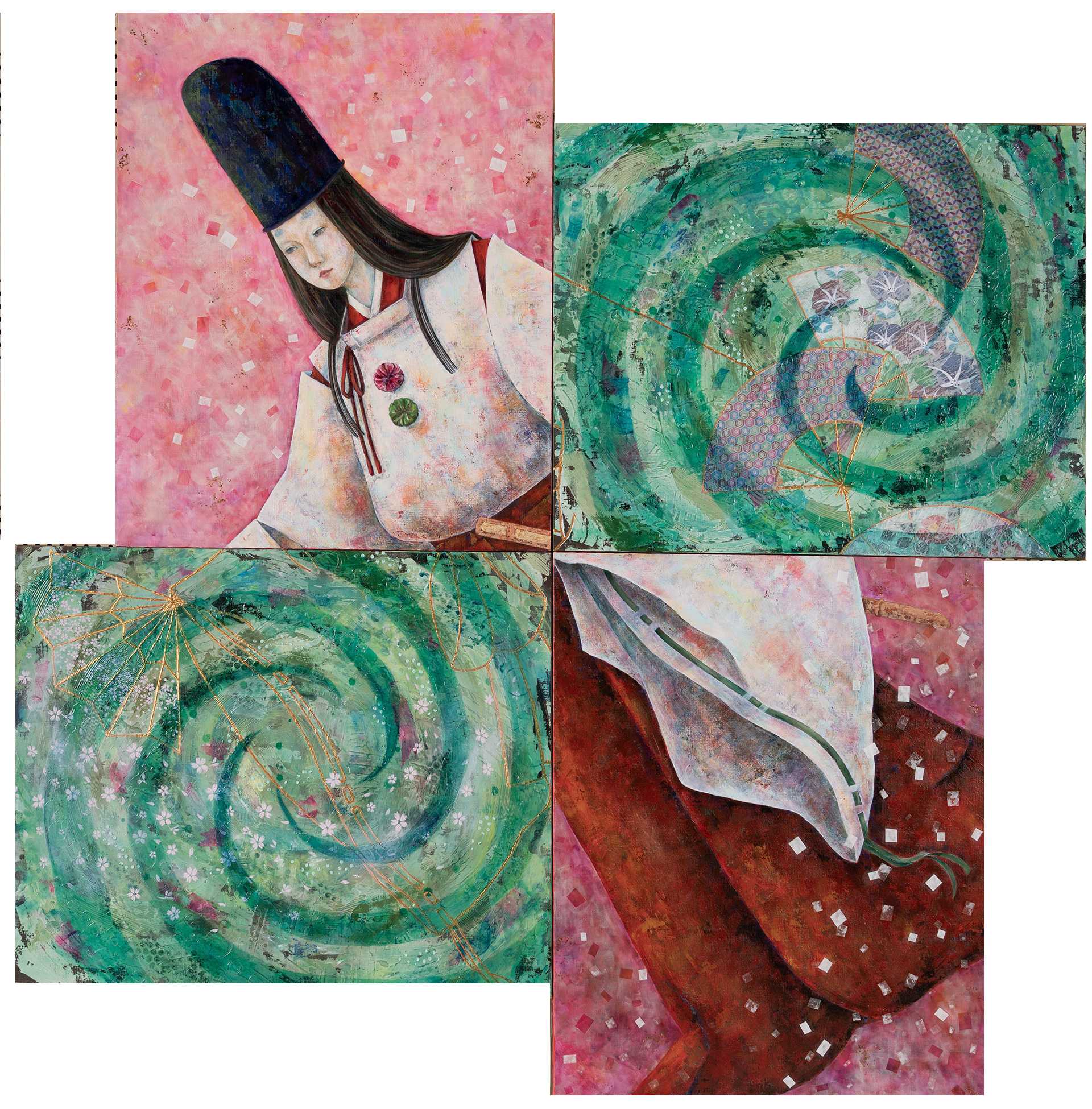 色彩は日本の伝統色にこだわり、まず赤色の使用を考えた。赤は日本では邪気を払、魔除けの色とされている。あずき、赤飯、Japan Redと言わるベンガラ、漆器や鳥居で頻繁に使用する朱色、黒を少量入れた赤のジェッソを地塗りとした。背景は宗達の屏風絵を参考にした方眼を描いた。その上に油彩で世界地図(オーサーグラフ)を投影した。ただオーサーグラフとF100号キャンバスは縦横比が異なり、さらに拡大されているので、世界地図は歪み、不思議な形態となった。