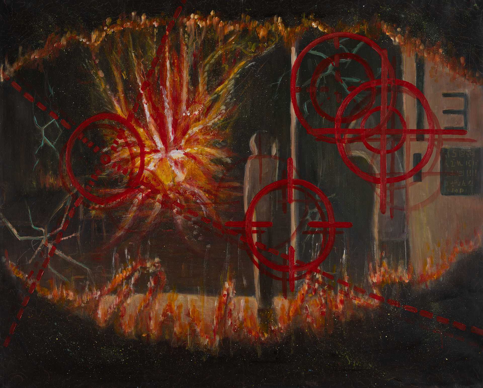 黄金色の曲線は、鉄のカーテン、ベルリンの壁、パレスチナとイスラエル、ウクライナとロシア、南北朝鮮、南北キプロスや国境の空間的形態を表す。我々は分離壁を想像するときは垂直にあるコンクリートの姿を想像する。しかし、その壁が地表空間でどのような形態で存在しているかは知らない。かつてのベルリンの壁は東京23区に匹敵する西ベルリンを取り囲んでいた。ここではいくつかの壁を取り上げ、さらに黒の断裂を地球上に表した。そして2025年この世界を覆うのは絶望、不安、叫び、不条理などが地球を大蛇のように締め付ける。