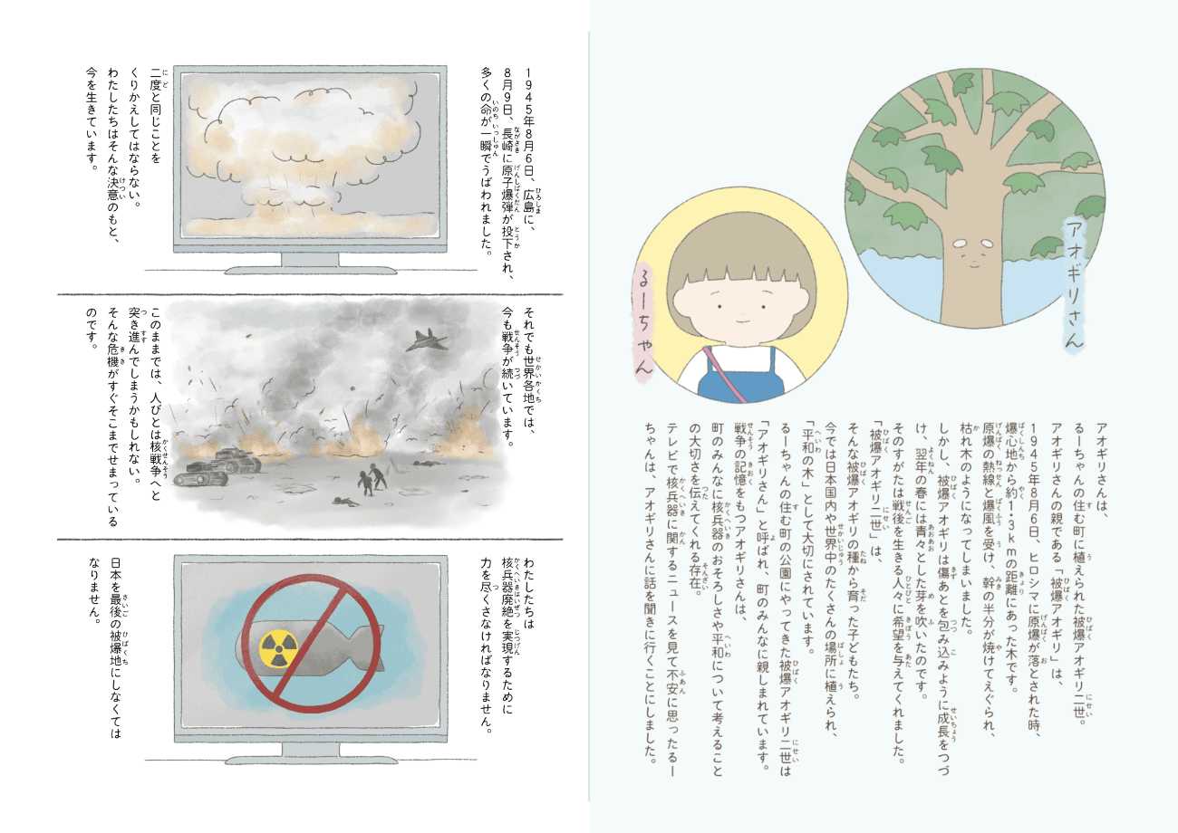 アオギリさんは、広島で被爆を経験した「被爆アオギリ」の種から生まれた「被爆アオギリ二世」。第二次世界大戦の記憶をもつアオギリさんは、もう二度と同じことが起こってはならないと、るーちゃんに「核なき世界」を目指すことの大切さを伝える。