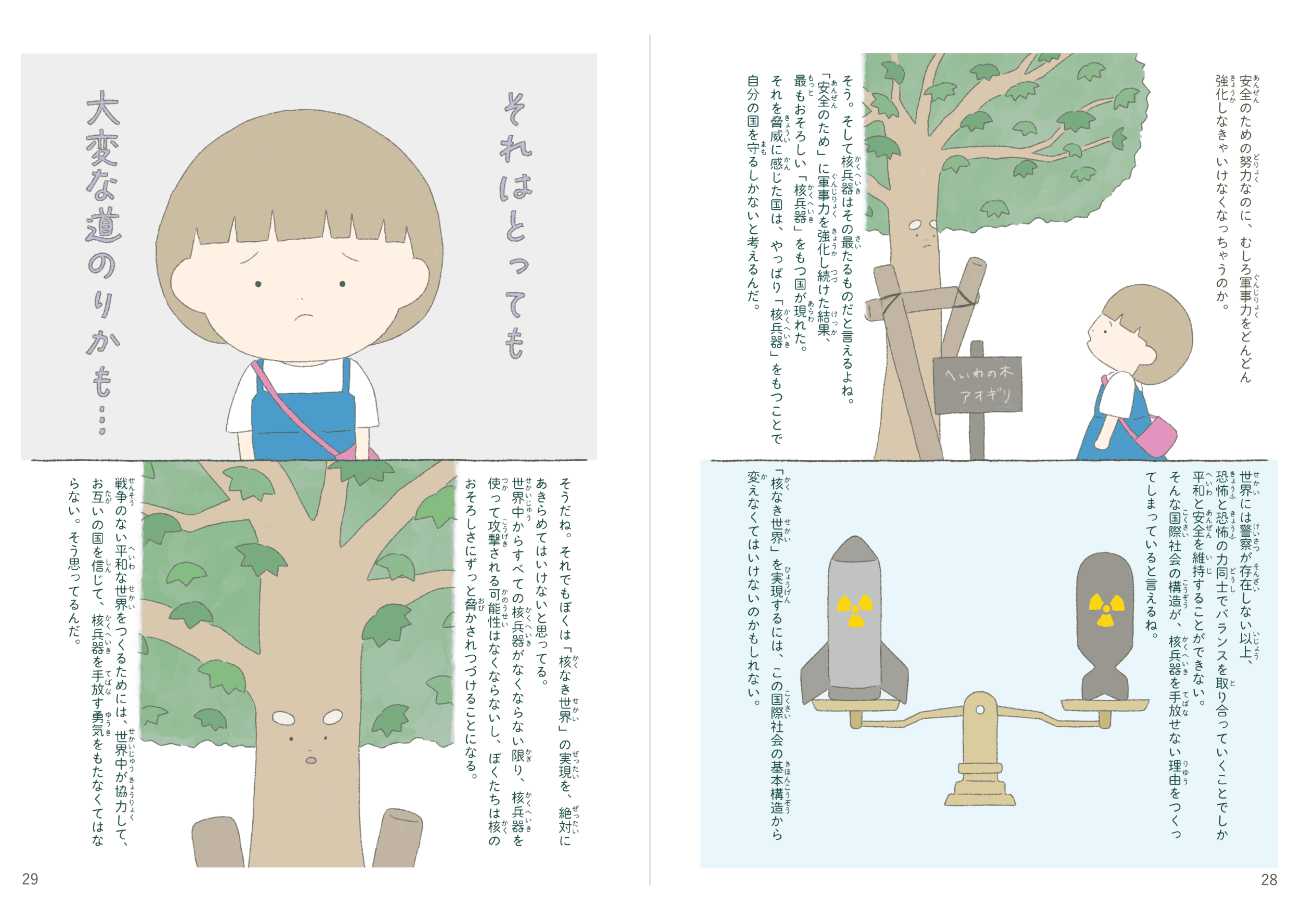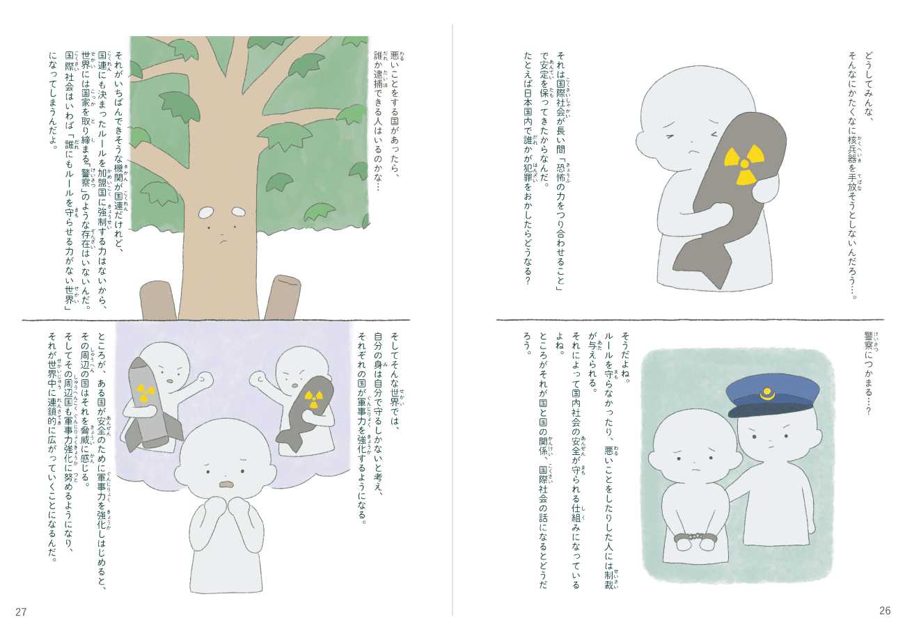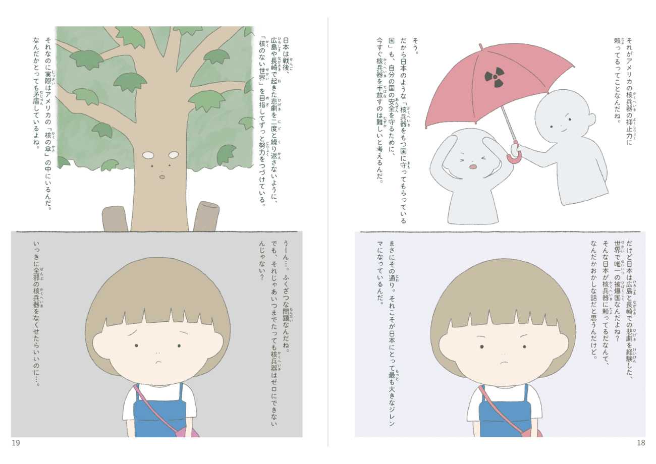 本作品は、「戦争のない世界」「核なき世界」を実現するために、私たちはどうしたらいいのかを考えるための絵本です。何か一つの答えを押し付けるような目的ではなく、一人ひとりの「自分ならどう考えるか」を後押ししたいという思いで制作しました。またどうしても近寄りがたさを感じてしまう核兵器の問題について、イラストが持つ親しみやすい印象を与える力と、複雑な文字情報を視覚的に補完する力で、問題に対するハードルを下げることにも挑戦しました。