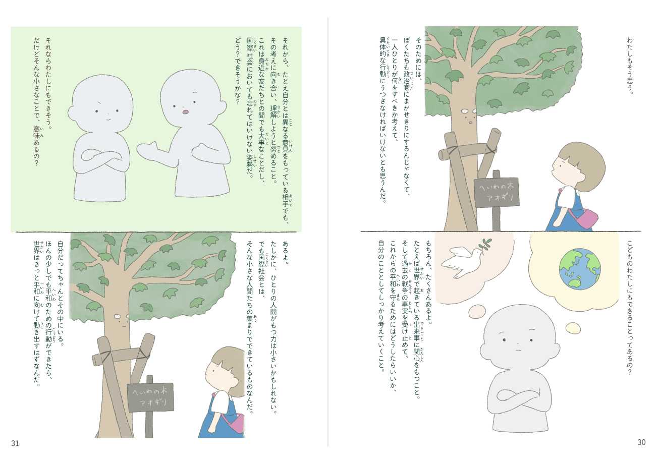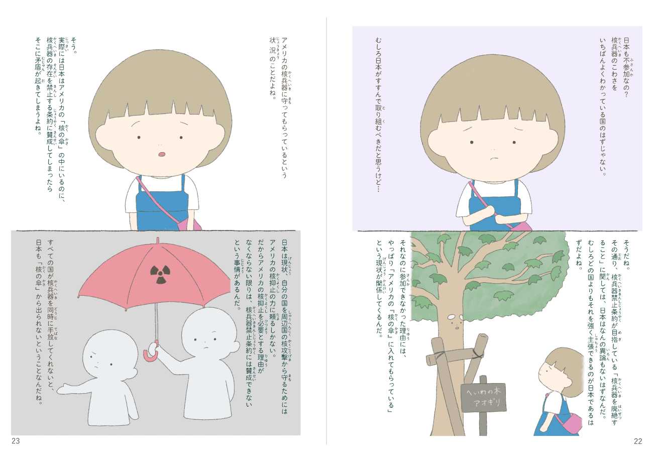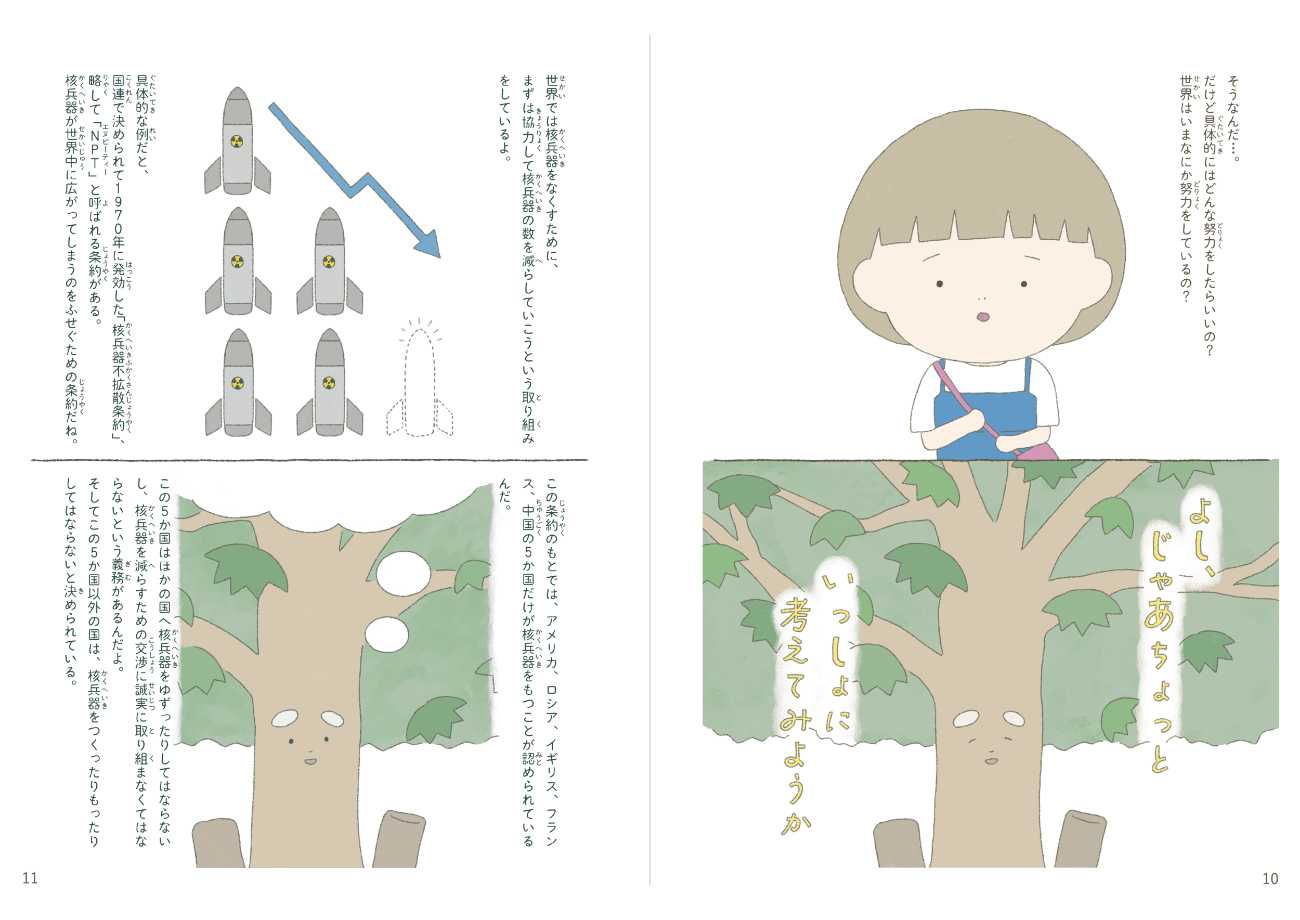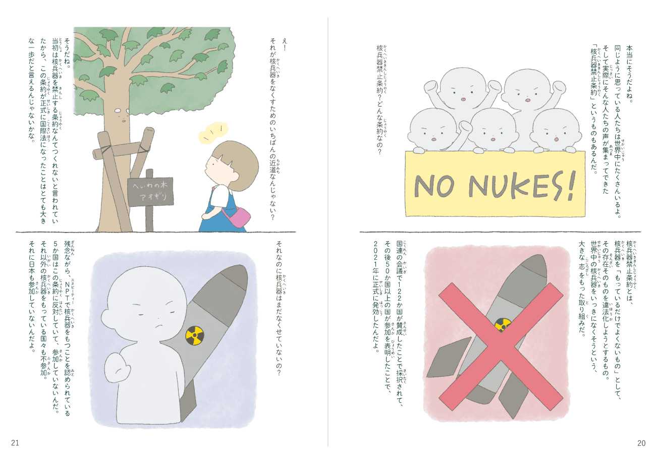 本作品は、「戦争のない世界」「核なき世界」を実現するために、私たちはどうしたらいいのかを考えるための絵本です。何か一つの答えを押し付けるような目的ではなく、一人ひとりの「自分ならどう考えるか」を後押ししたいという思いで制作しました。またどうしても近寄りがたさを感じてしまう核兵器の問題について、イラストが持つ親しみやすい印象を与える力と、複雑な文字情報を視覚的に補完する力で、問題に対するハードルを下げることにも挑戦しました。