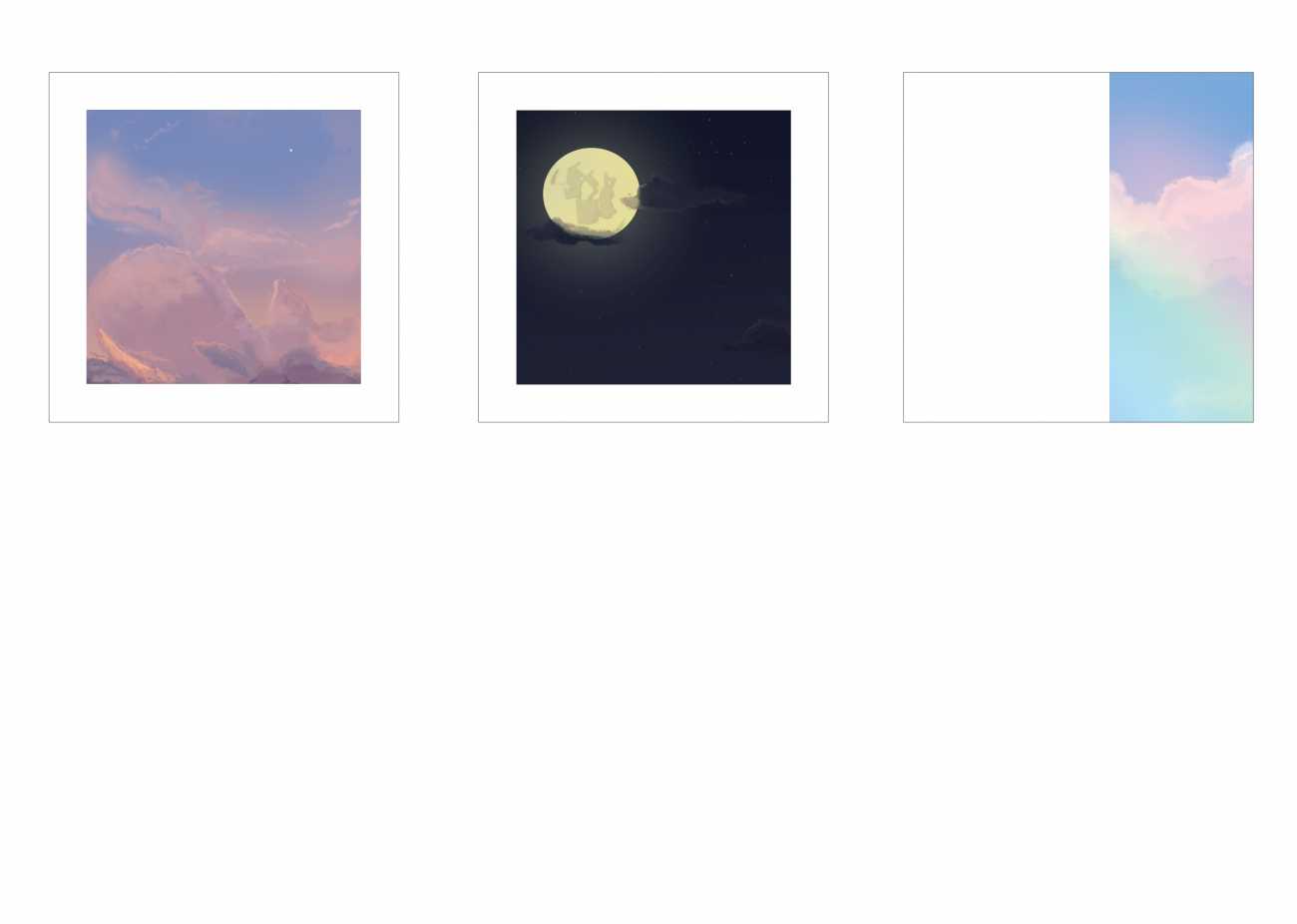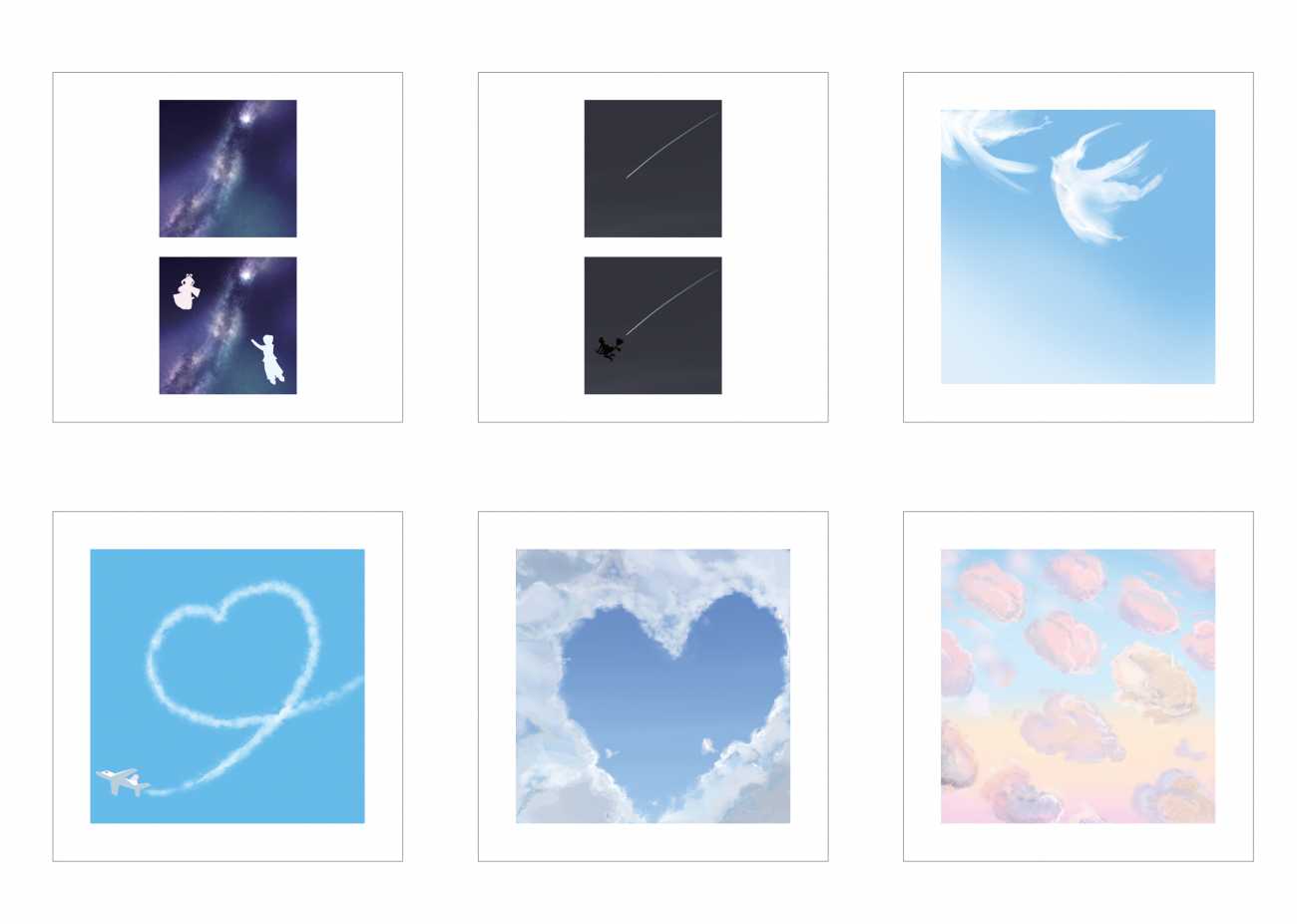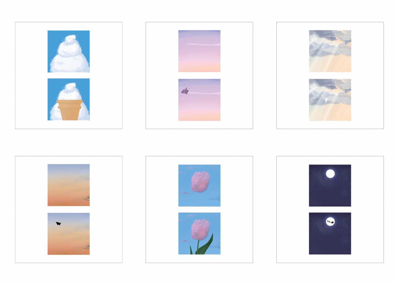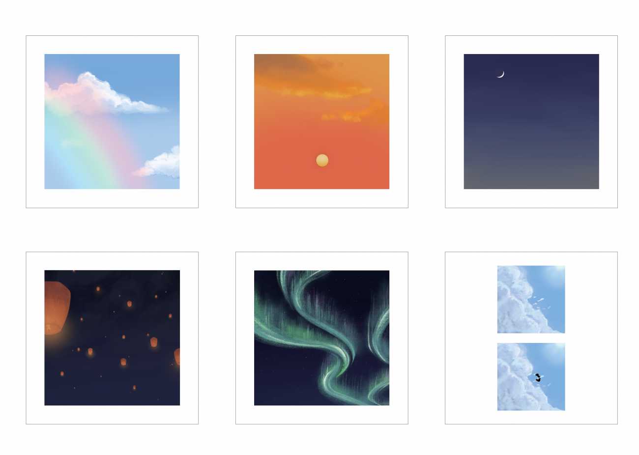 作品全体は、大きく三つの段階に分けて構成しています。一つ目は、日常の中で実際に目にすることのありそうな、現実的な空です。何気なく見上げた空に、その日の気分や感情が静かに映り込む瞬間を描いています。二つ目は、雲を別のものに見立てたり、空に物語を重ねたりした、誰もが一度は想像したことのある空です。幼いころの遊び心や自由な発想を、現実と地続きの風景として表現することで、過去の記憶と現在をつなげています。三つ目は、実際には見たことがないものの、見てみたいと感じる空です。想像力の先に広がる少し不思議でやさしい世界を描くことで、鑑賞者自身の願いや憧れを重ねられる余白を意識しました。