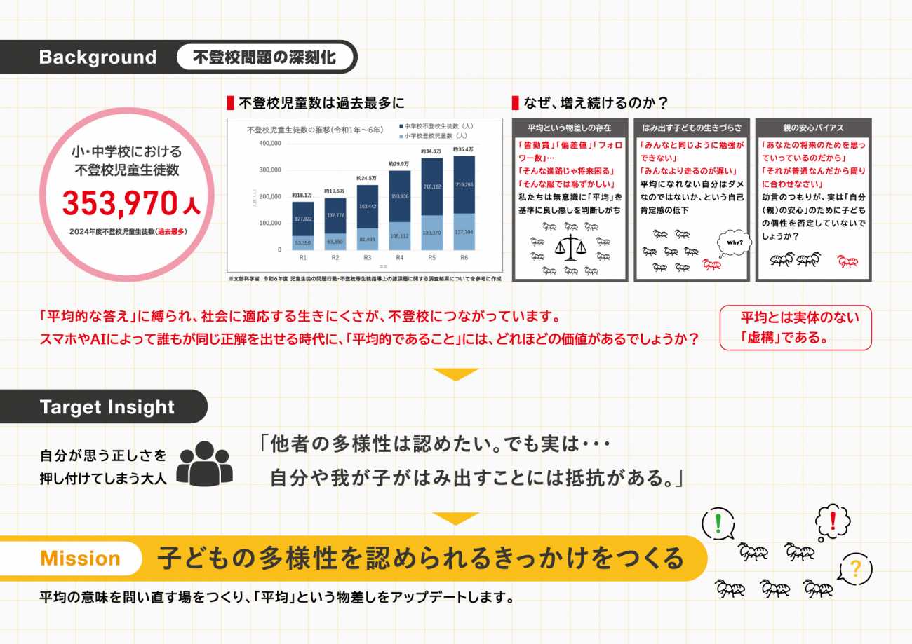 大人が無意識に抱える「安心バイアス」を解除し、「普通」を求めようとする関わり方から、子どもたちの多様なあり方を肯定する関わり方へ。 大人の行動変容を導き出し、次世代が生きやすい土壌をつくるためのきっかけづくりの場が「平均展」です。