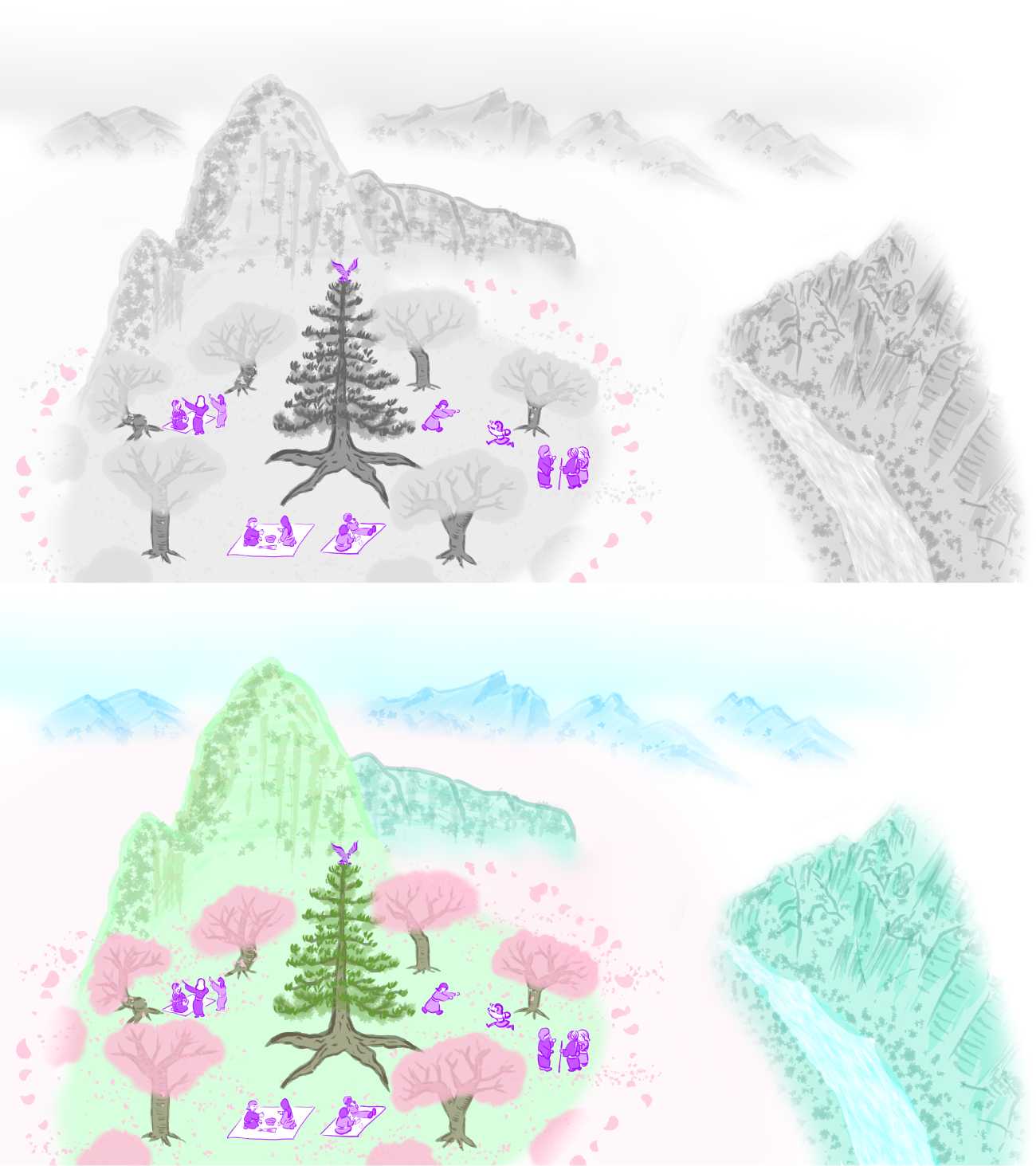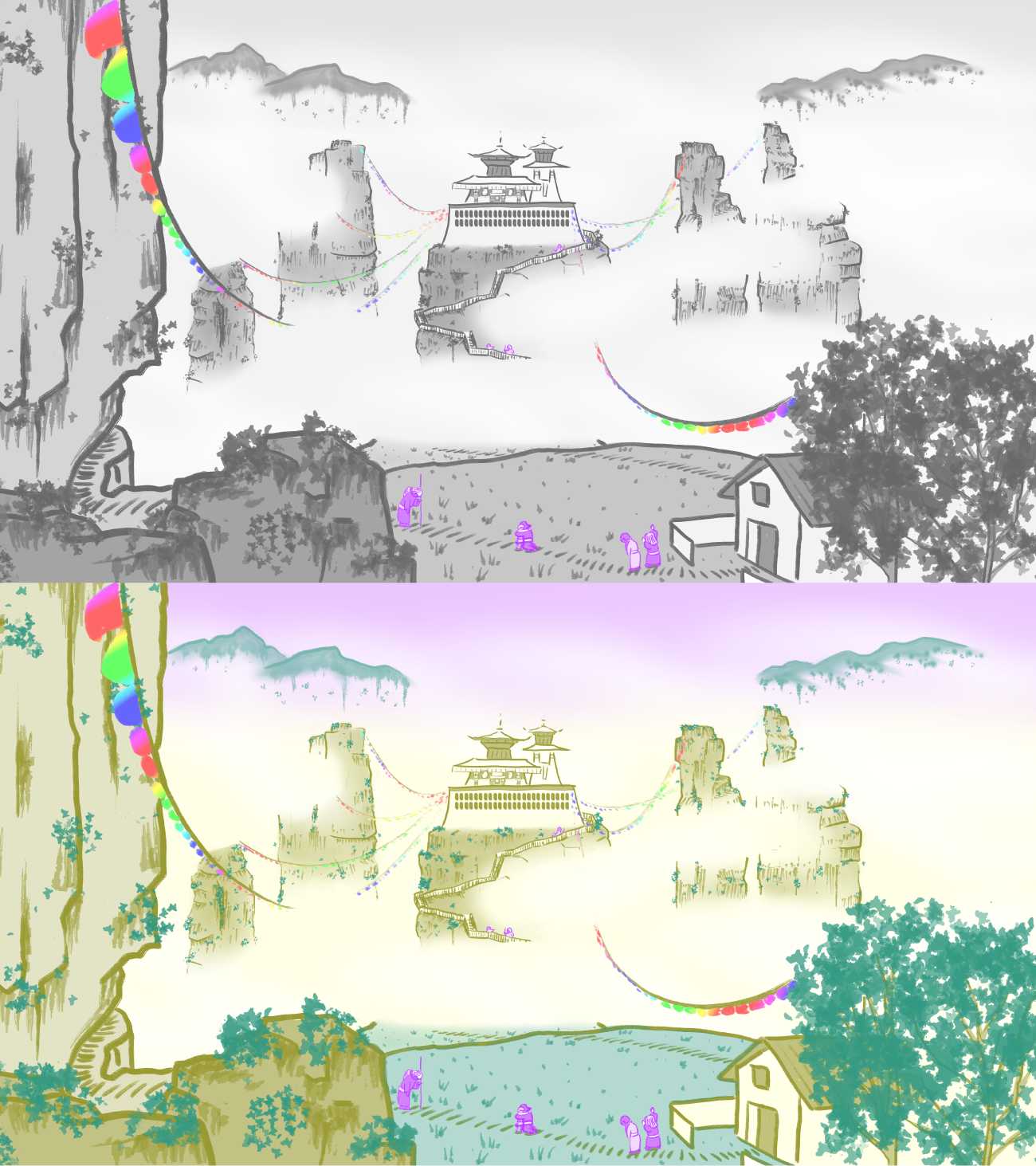 作品は動画で鑑賞してください。動画では作品全体を一枚絵として鑑賞できます。絵巻物を見るような感じで鑑賞していただけると嬉しいです。白黒バージョン(一部着色)とフルカラー・バージョンがあります。