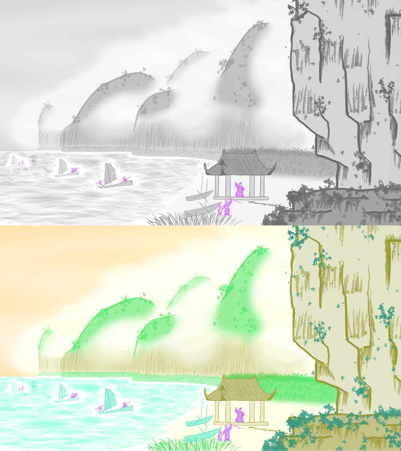 遠浦帰帆:中国の桂林、ベトナムのチャンアンやハロン湾等参考に想像した風景です。この絵の世界では船でも何でも物をもらったり、あげたりすることにこだわりがないようです。声さえ掛ければ自由に使えるようです。
