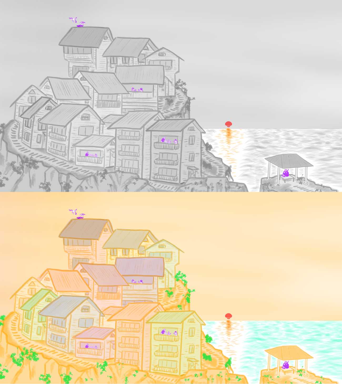 漁村夕照:イタリアのチンクエテッレを参考に、斜面に積み重なるように建てられたカラフルな街並みが夕日に染まる景色を少し昭和レトロな雰囲気で描いてみました。天辺の家の屋根に次の場面から飛来した鳥がいます。