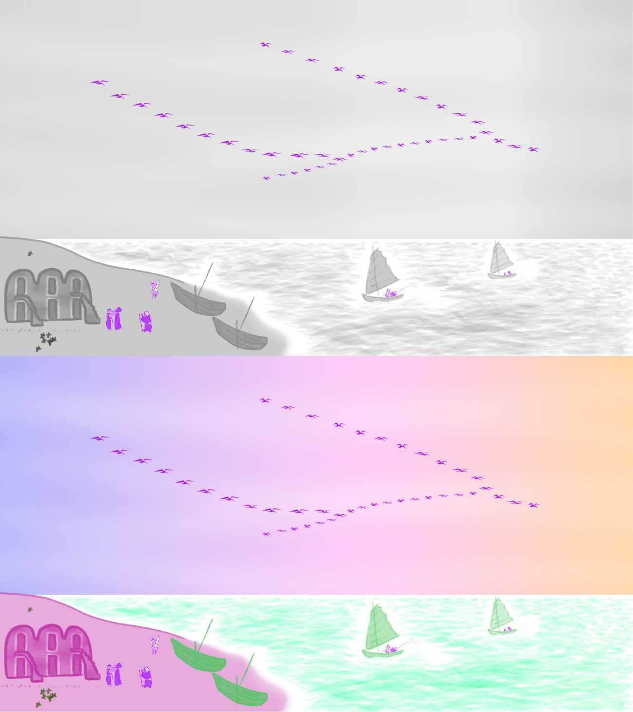 作品全体を一枚絵として鑑賞できるよう横スクロールしています。まず右から左へスクロールし、次に最後の場面で折り返して左から右へスクロールして最初の場面に戻ります。こちらは白黒バージョン(一部着色)です。