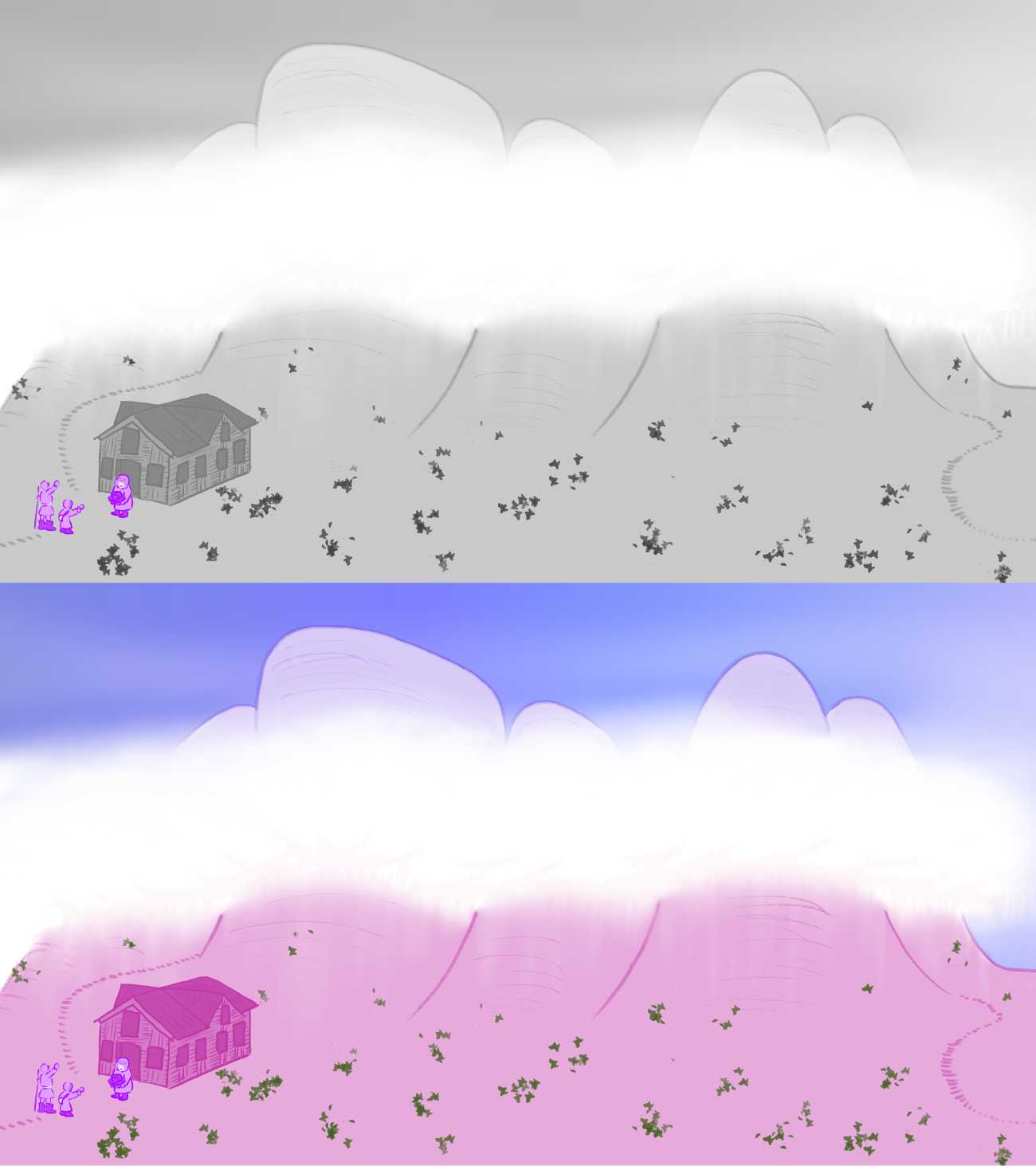 瀟湘夜雨:オーストラリアのカタジュタを山水画っぽく少しデフォルメして描いてみました。次の場面とのつながりで、左端にスイスのログハウスを描きました。その前では雨合羽と防寒着を贈り合っているようです。
