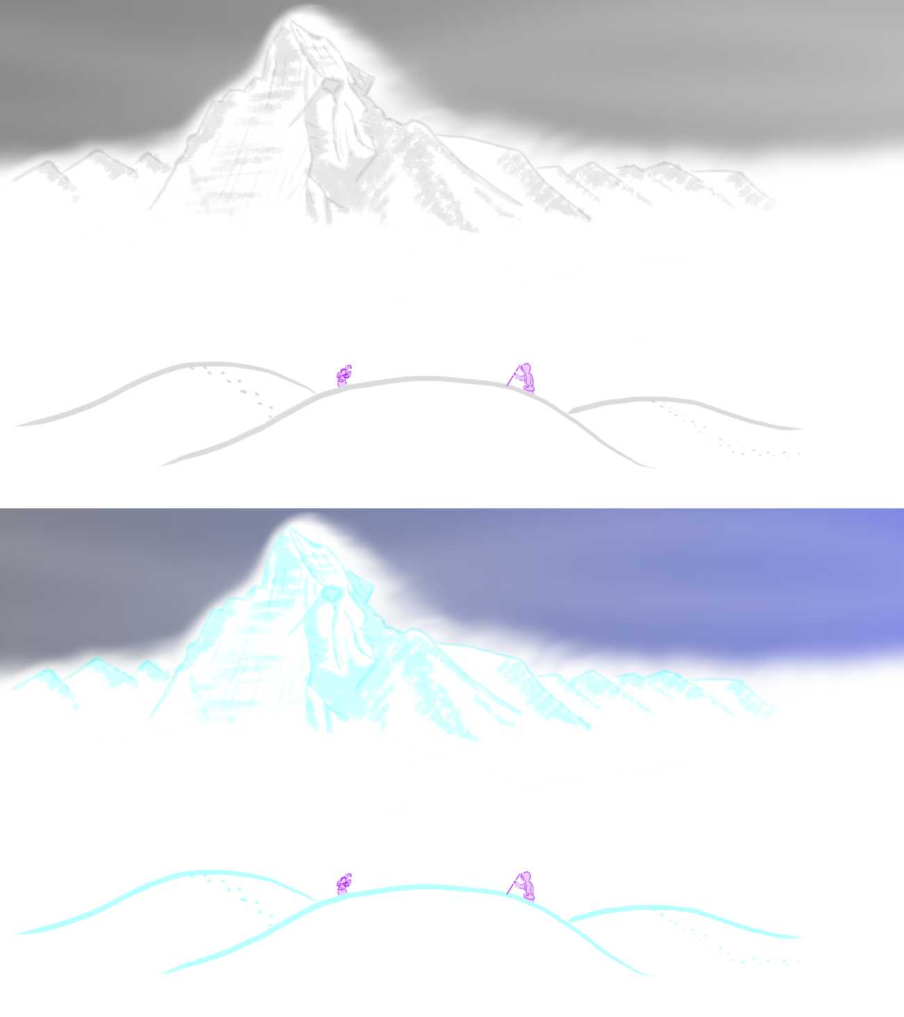 江天暮雪:スイスのマッターホルンを少しデフォルメして、何となくアッシリアの守護精霊ラマッスの横顔っぽく見えるように描いてみました。一見つまらない真っ白な画面で雪山の寒さと静けさと眩しさを表現しました。