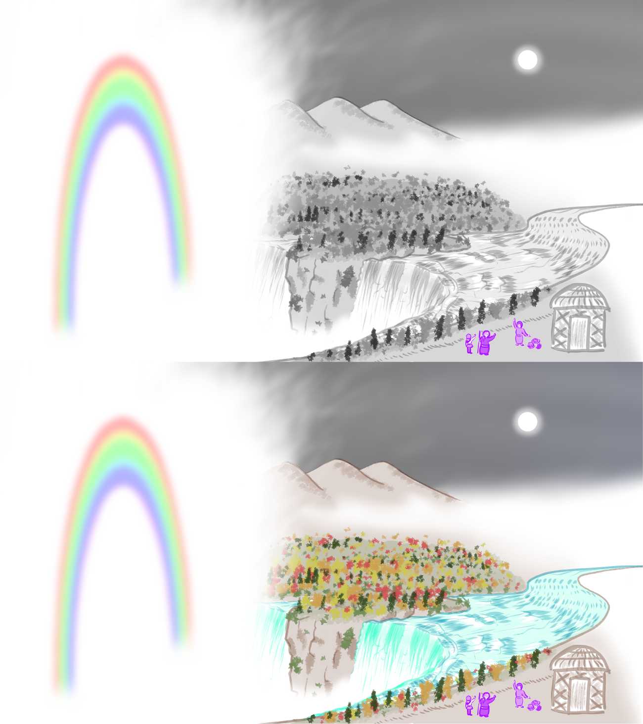 洞庭秋月:カナダのナイアガラの滝を参考に、滝壺から湧き上がる水煙に浮かぶ月虹を描きました。右端の建物は北米先住民族の家ロングハウスです。その横に防寒着が置いてあります。贈り物なのかも知れません。