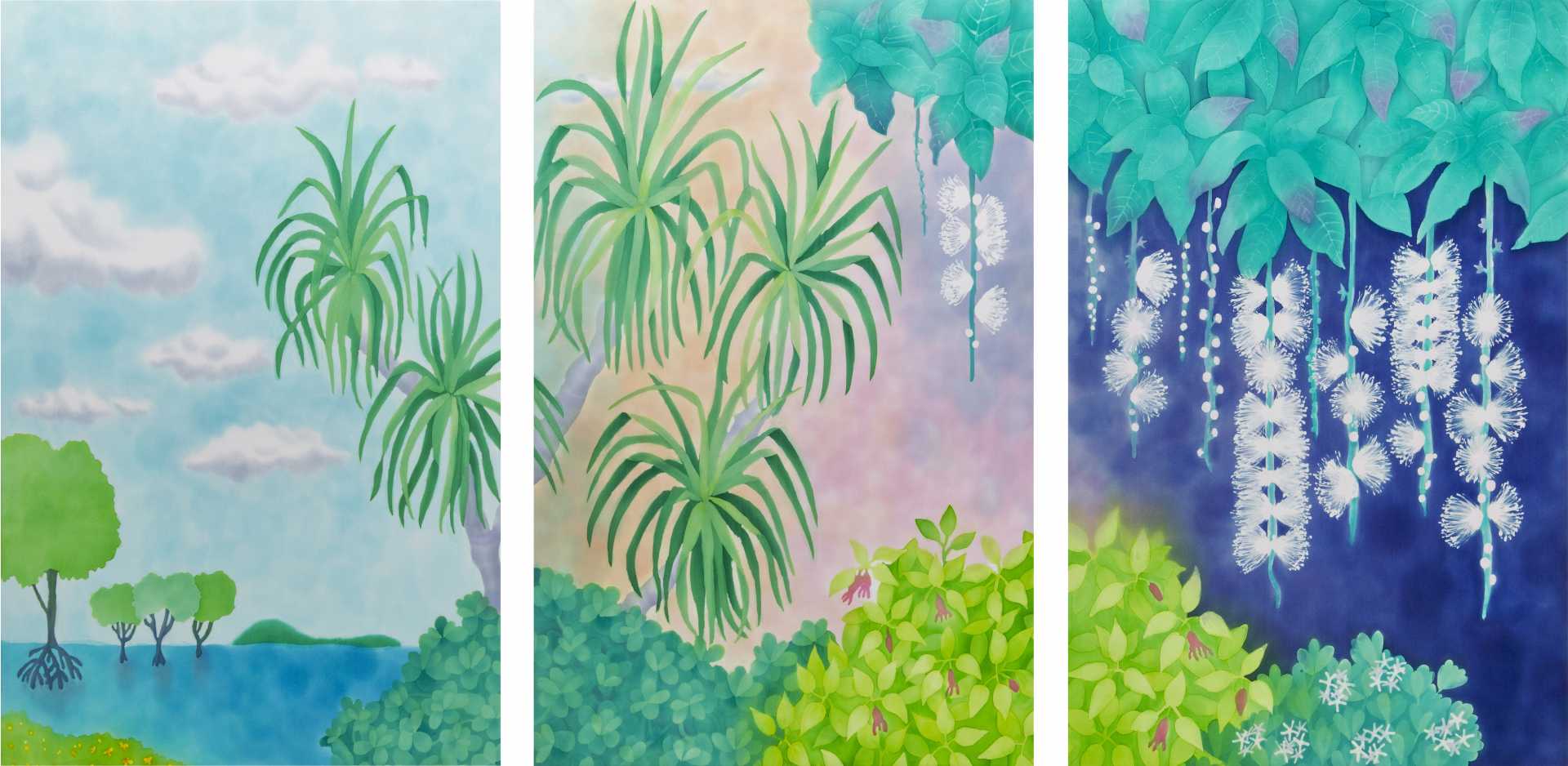 手芸好きの母の周りにあった糸や布、国内外の旅の先々で出会った色・形・風景、我が子と森や水辺で遊び手を動かした記憶の片鱗が今の作品に現れる。伸びてゆきたい方向に向かい“自分になってゆく”感じを味わっている。
