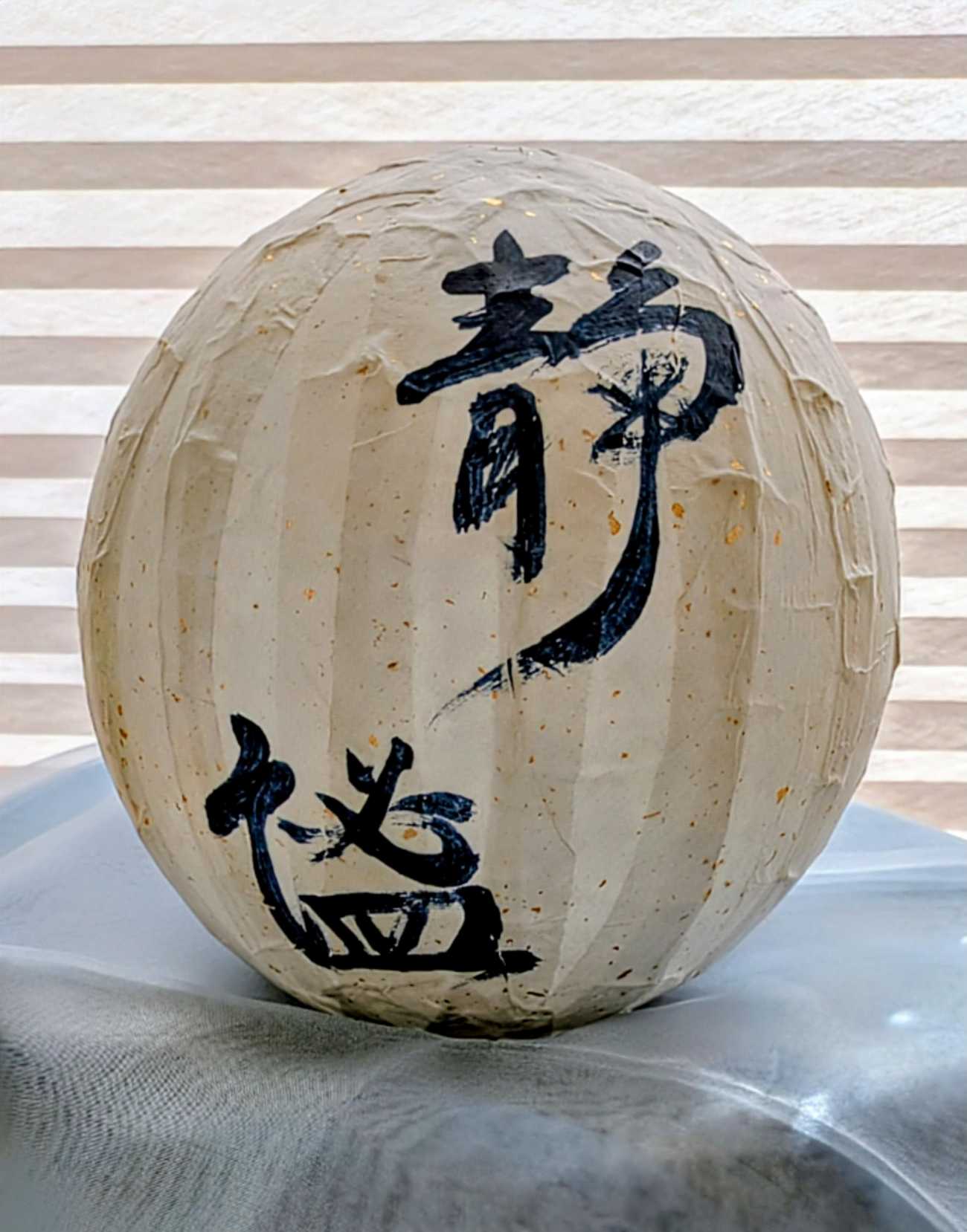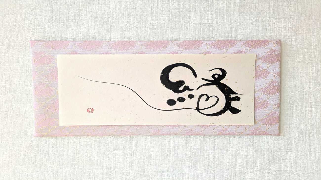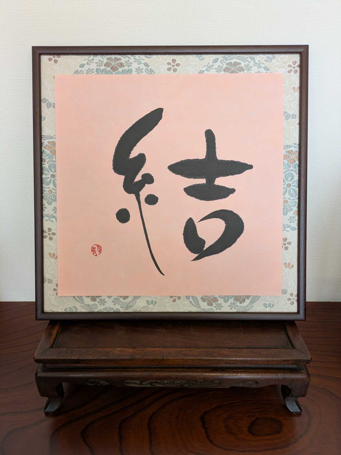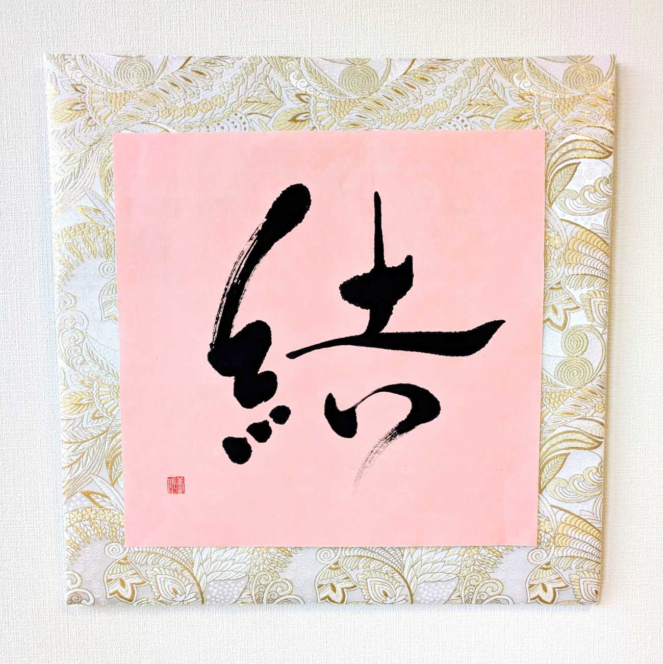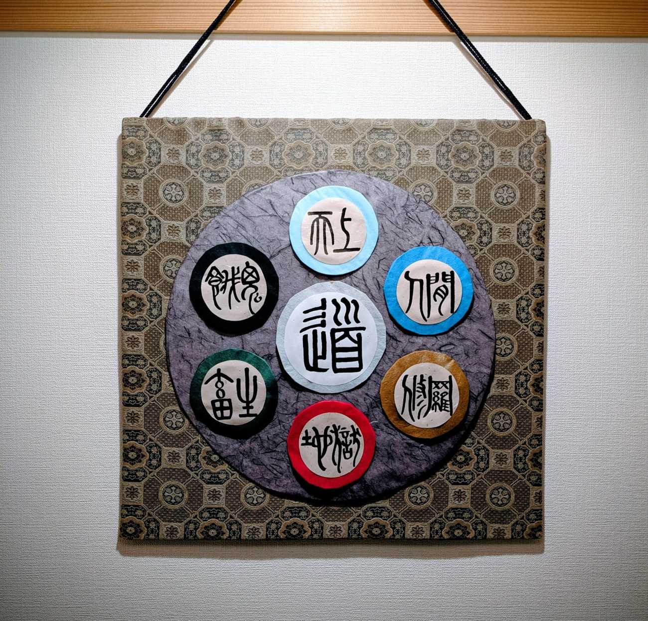 「えん」という言葉をキーワードに、形としての「円」と人との繋がりを表す「縁」をテーマに制作した。今までやってきた書とは違う作品作りを目指し、美濃和紙や西陣織の伝統素材が持つ魅力を生かしながら、現代的な感性や装飾を取り入れることで書の新しい可能性を探る試みとなった。