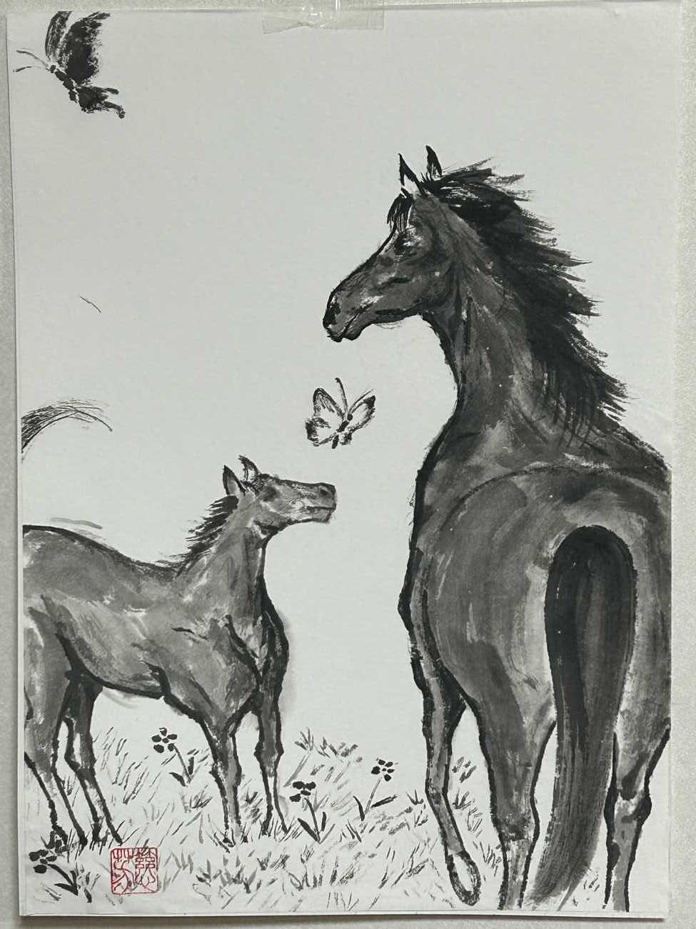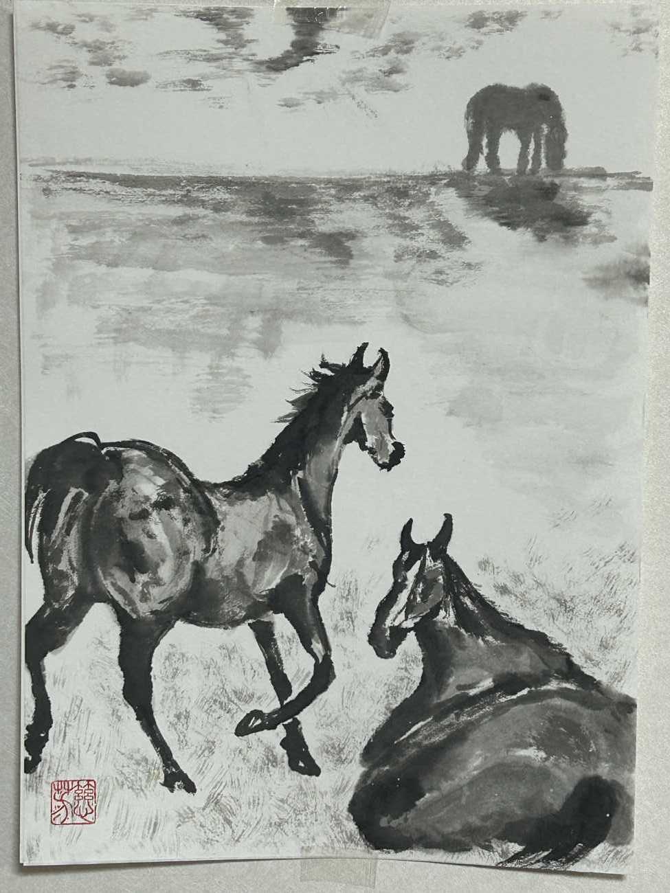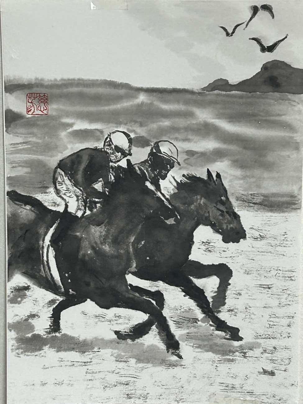 競走馬にもっとも重要な血統を感じさせるよう上から流れるように三場面を描き、時間軸に変化を持たせた。 背景の点描は、彼らに内在する継承されたDNAを、朱点は熱く燃える血潮を表現した。 湧き上がる砂煙は、これまでの戦ってきた何千何万の競走馬を表現している。