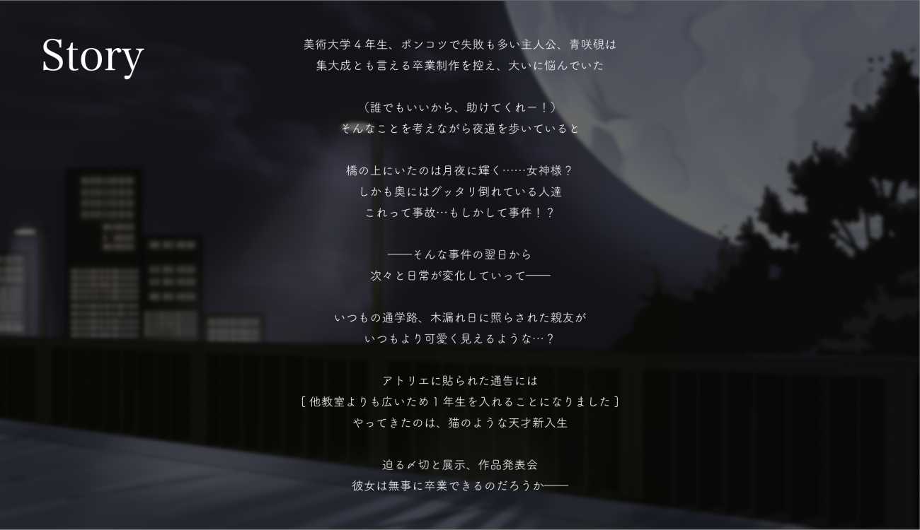 女性同性愛の恋愛ADVは、世界基準で見ると少なくはない。だが、その多くはキャッチーさと需要の多さから可愛い絵柄が中心となっているため、その隙間と得意な絵柄の交差する点を活かして制作した。