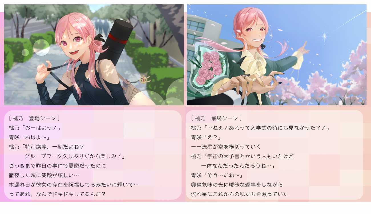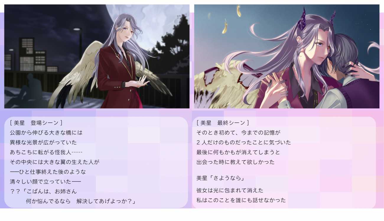 具体的にはスチルのちょっとした笑顔や、月夜に輝く青白い顔、少し強引に手を握られる仕草などである。これらをやりすぎない程度に散りばめ、キャラクターのパーソナリティから外れないように組み立てた。