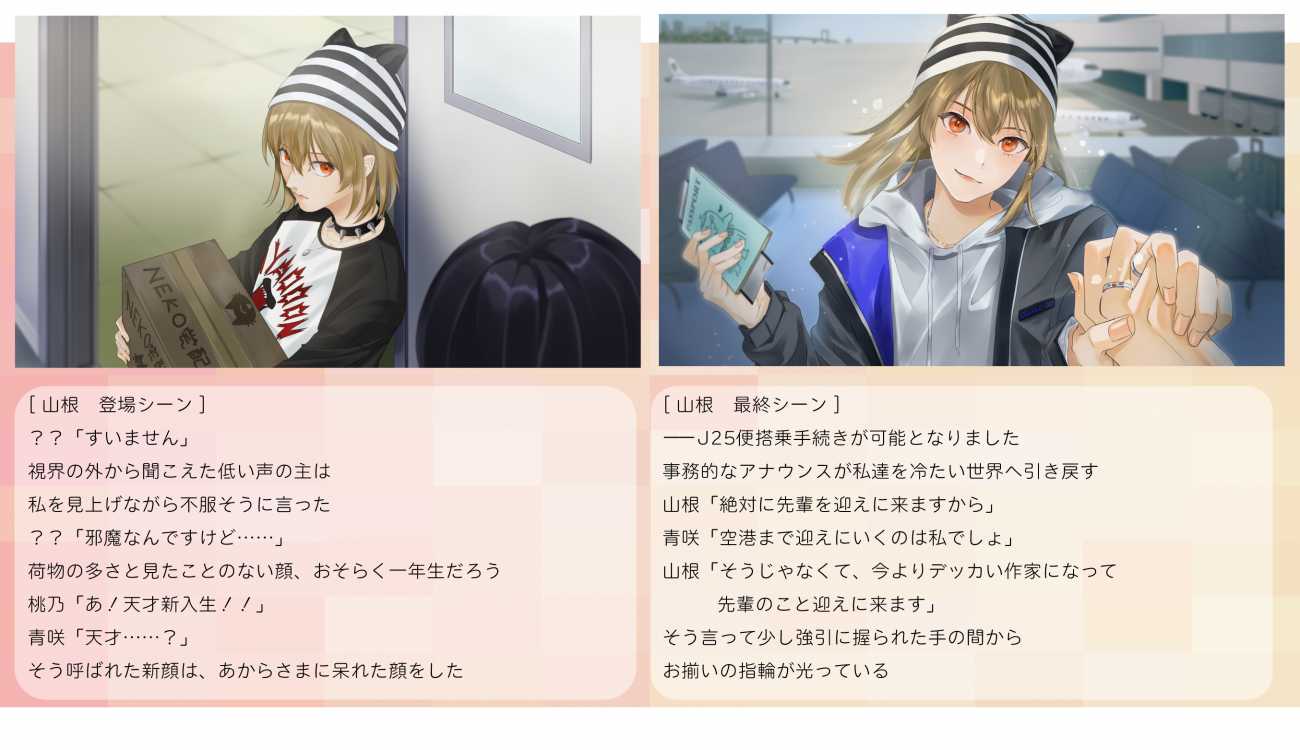 まず、恋愛ADVの市場ではプレイヤーと攻略対象の関係が対等ではないことも多く、これは乙女ゲーであれば、パッケージで男性が女性主人公を抱きしめたり取り囲んでいる構図や、ギャルゲーでこちらを照れたような顔で見つめている女性たち、という部分に表現されている。これは本編では意思を持った存在として描かれていたとしても、パッケージでは守られる存在として描かれることが、トキメキポイントとして表現されているのだ。だが、今回はそのイメージを刷新したいと考え、メインビジュアルでは従来の客体と主体を反転させるように、主人公をデッサンする攻略対象を描いた。