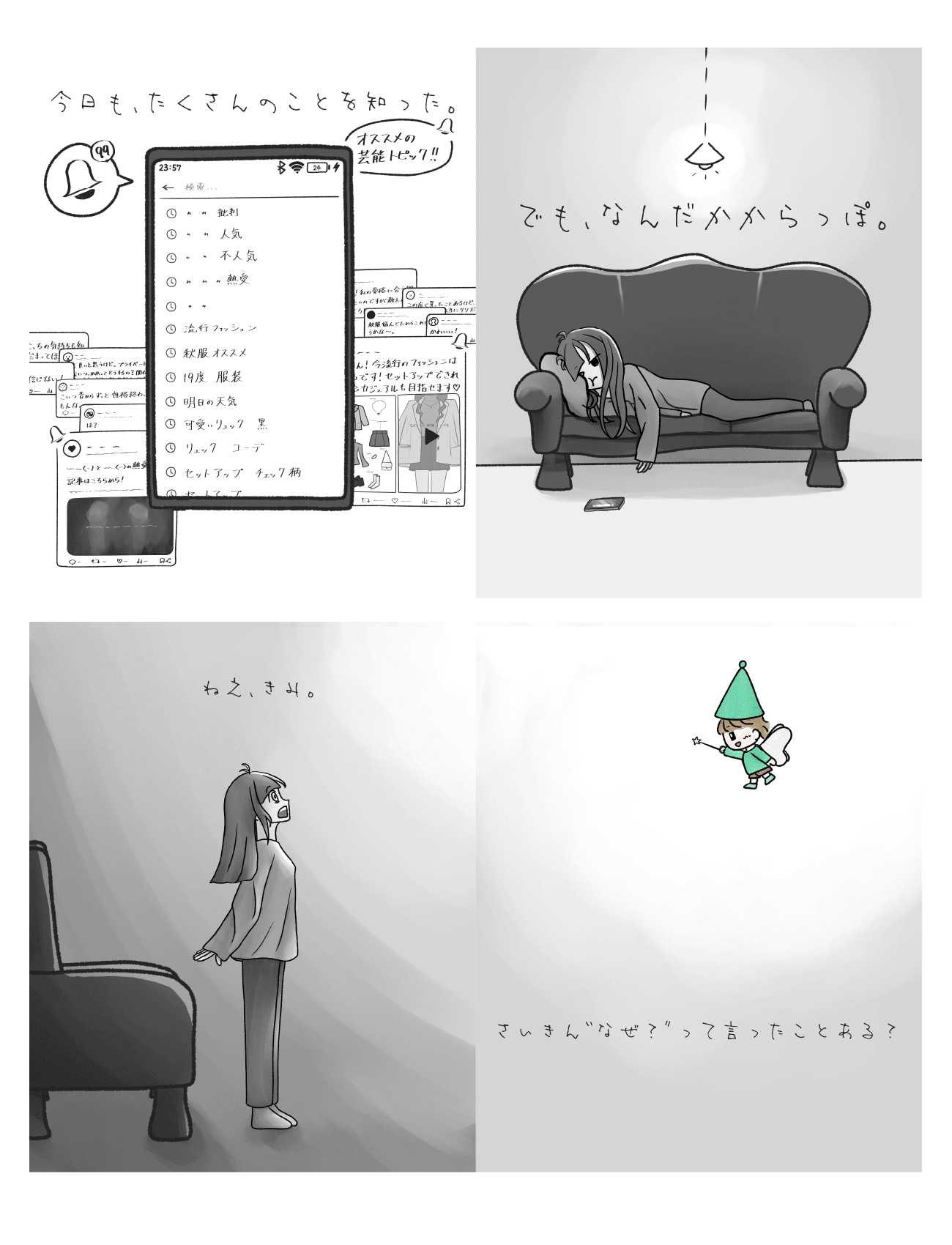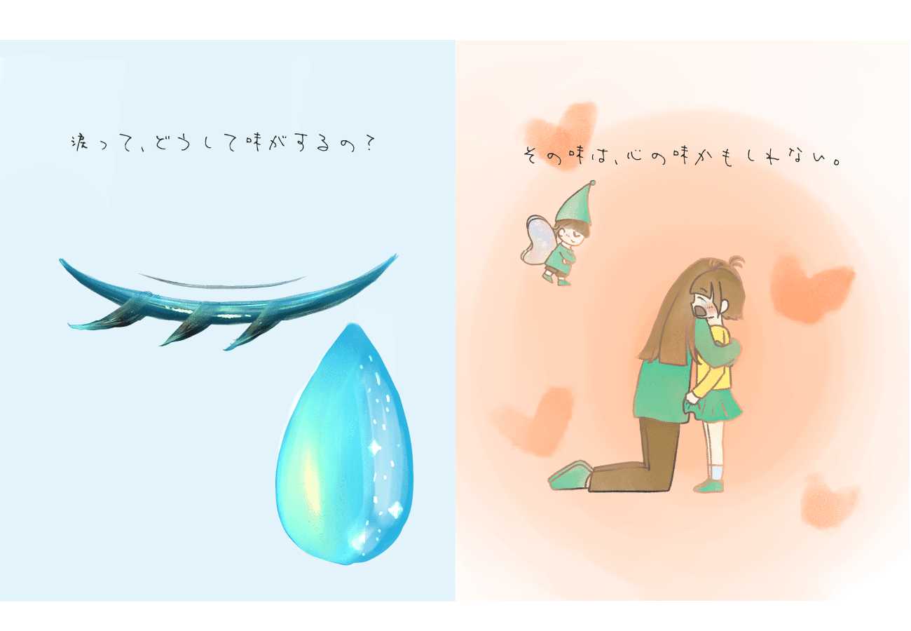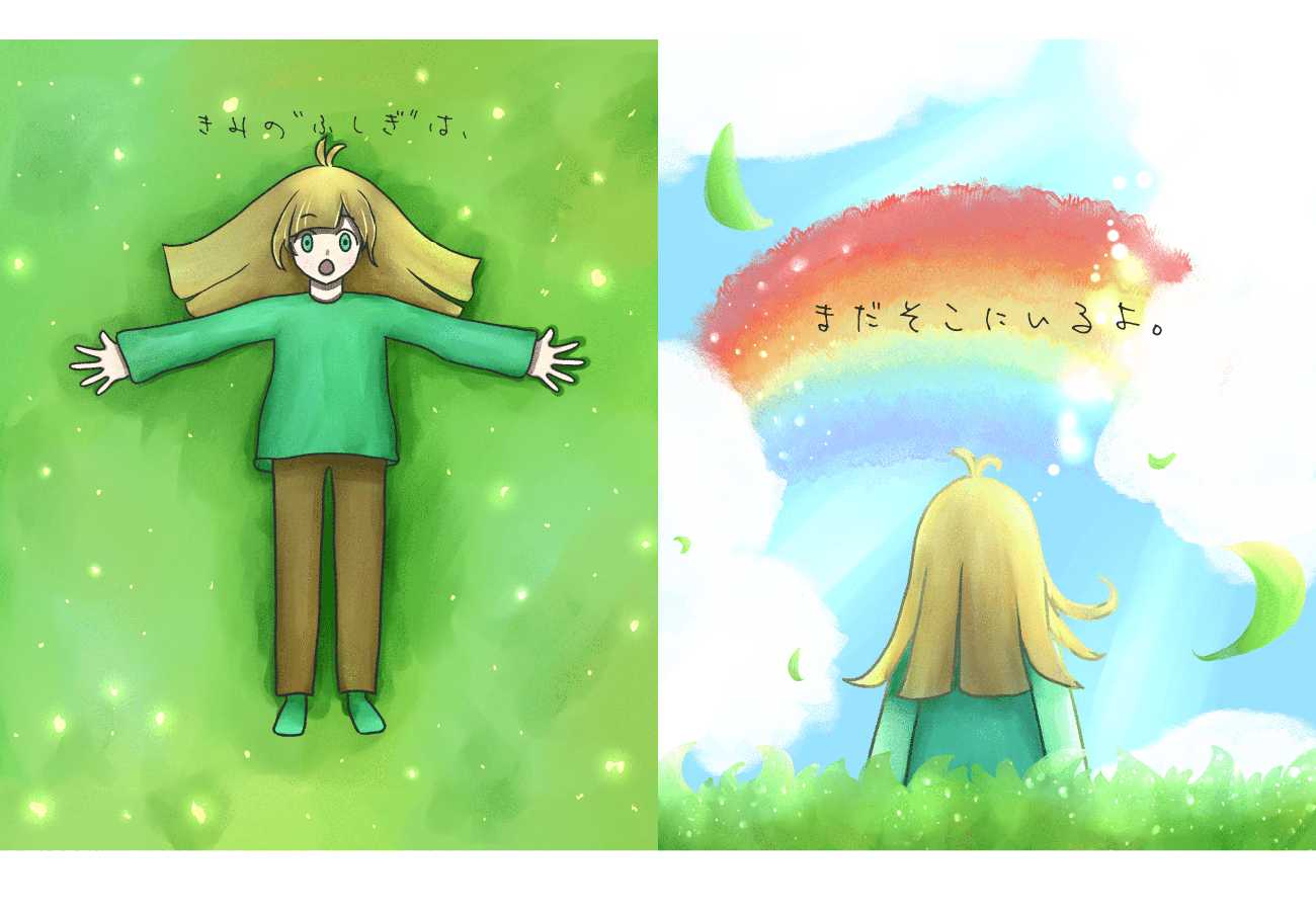 そんな時に思い出して欲しいのが“子ども心”です。私は幼稚園教諭の免許を取るために20歳という年齢で3歳児を相手に幼稚園で実習を行いました。学びながら園児と色んな関わりをしていく中でとても心に響いたのは「あの雲アイスクリームみたい!」「雲って食べれるのかな?」という子どもたちの会話でした。その時、そういえば私も昔雲は食べれると思っていたなということを思い出したのです。その時から“子どもの頃の自分”をとても意識するようになり、今回卒業制作を行うタイミングで絵本としてその感動を伝えたり子ども心を思い出して欲しいと思ったのでこのような作品となりました。
