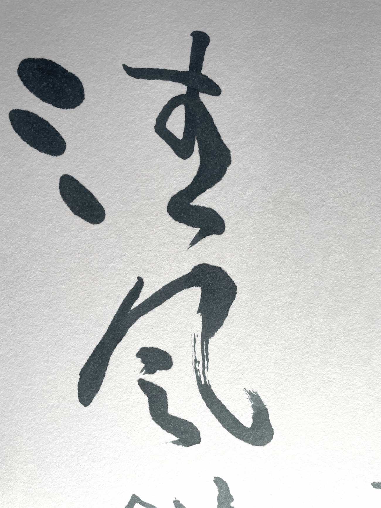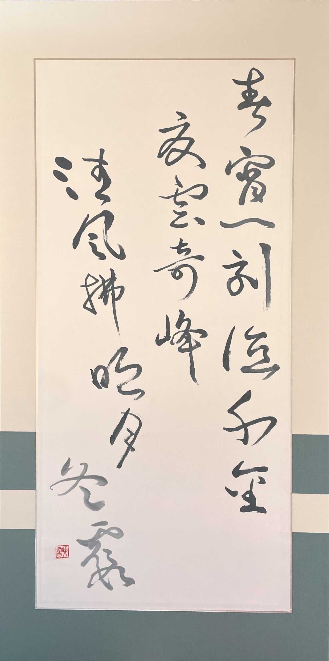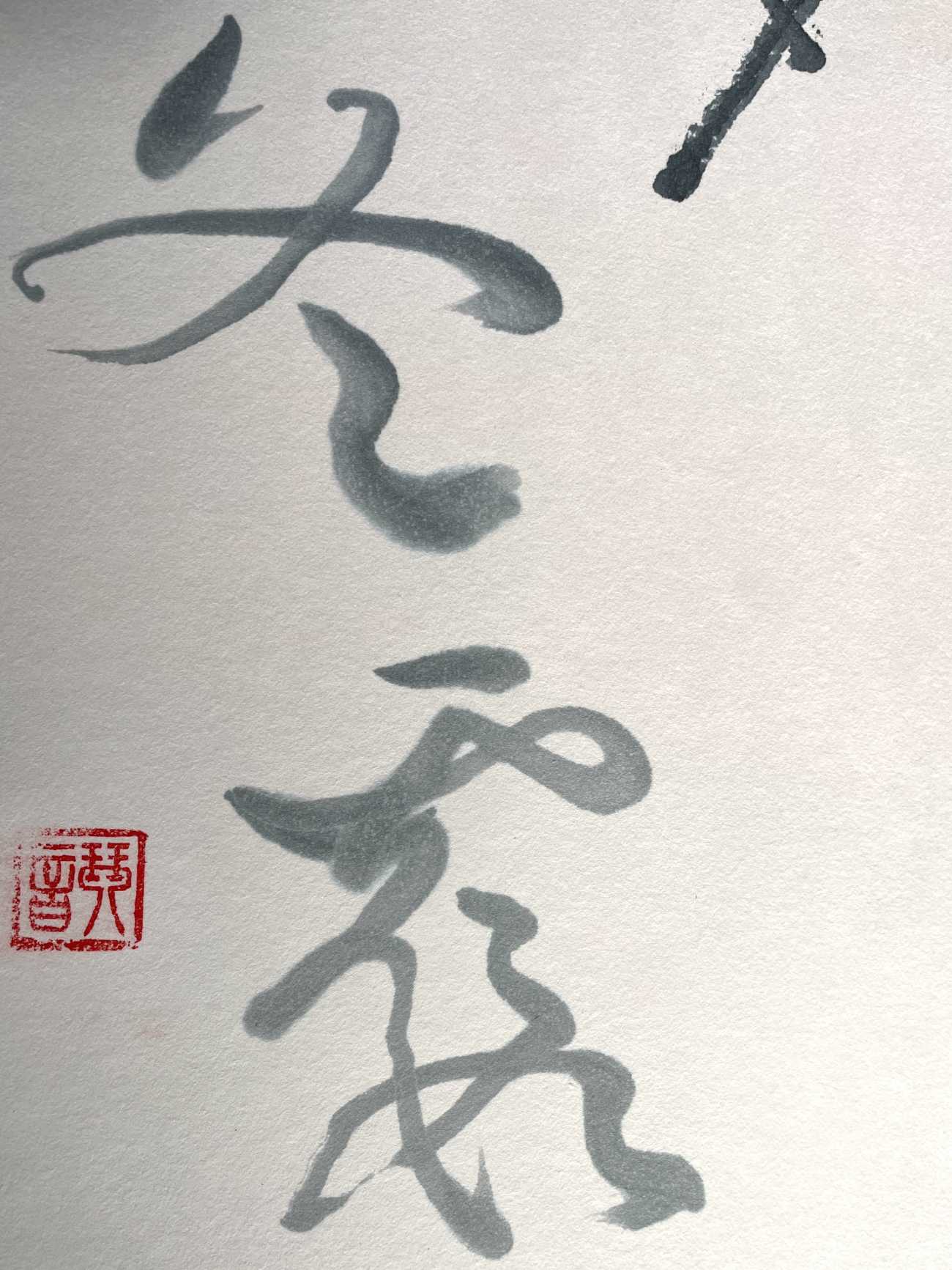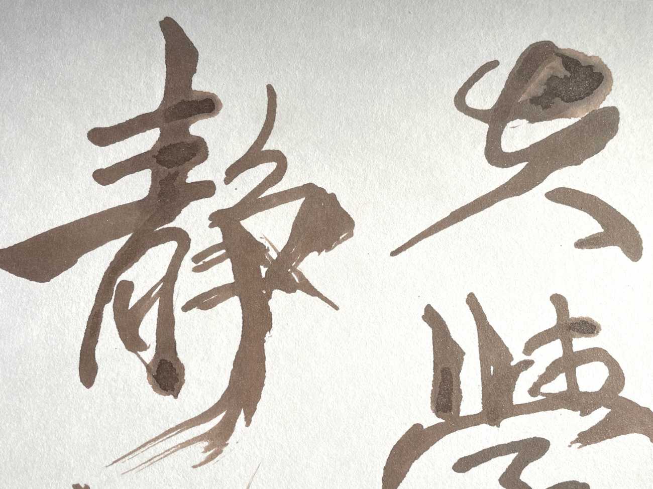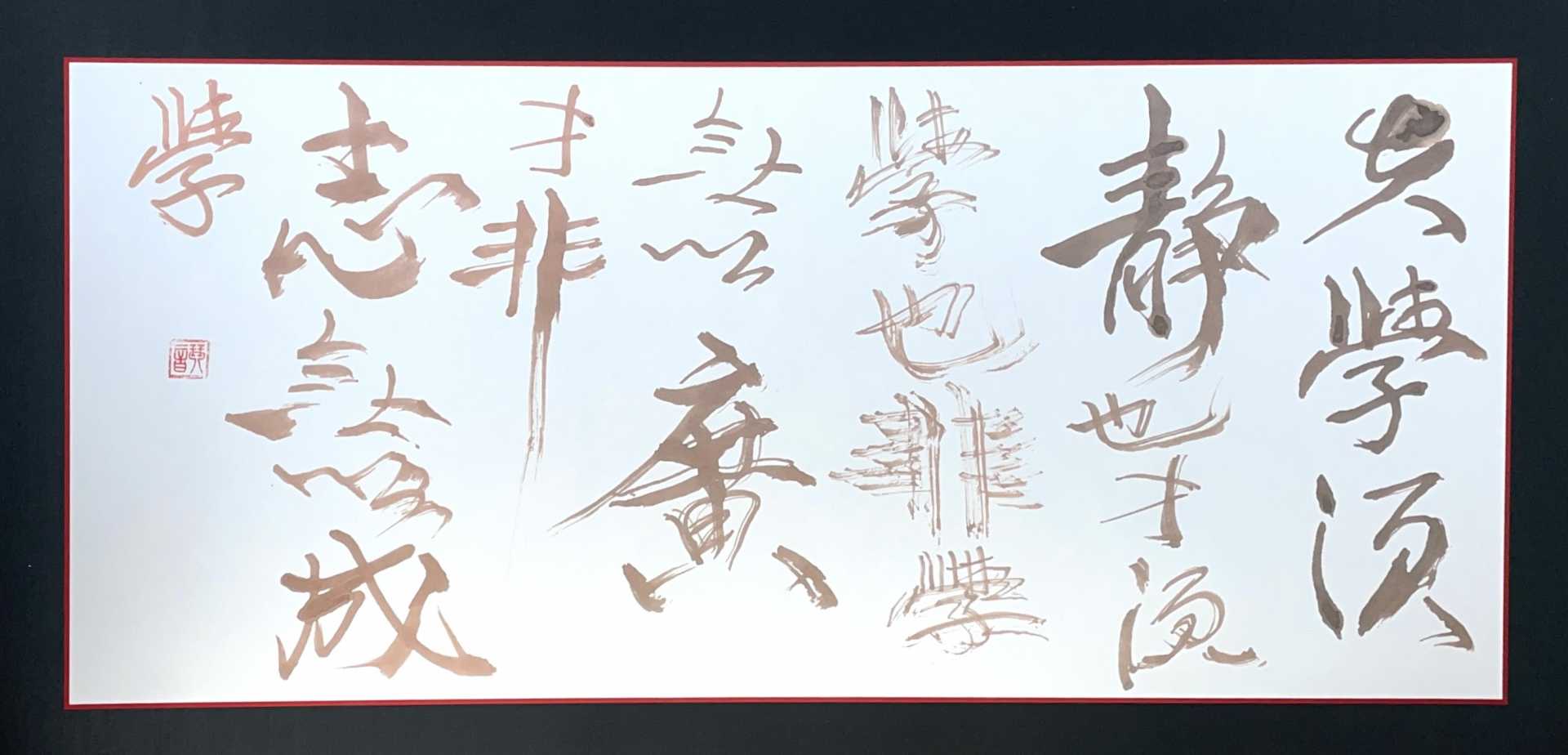 諸葛亮によって記された『誡子書』の一文である「夫学須静也 才須学也 非学無以廣才 非志無以成学」を書いた。心を穏やかにして学ぶことで才能は開花し、学ぶには志が必要不可欠。学びを深める者の内に宿る情熱をテーマに、文字の掠れや滲み、墨色、竹筆による線質にこだわり制作をした。私自身の誡めとなる作品でもある。