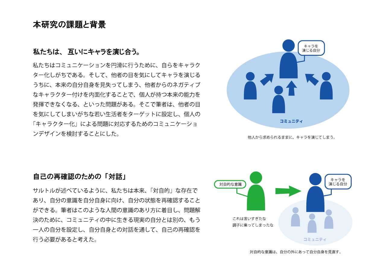 私たちはコミュニケーションのために、自らをキャラクター化しがちである。そして、キャラを演じるうちに、自分自身を見失ってしまうという問題がある。そこで筆者は人間の対自的な意識のあり方に着目し、問題解決のために、コミュニティの中に生きる現実の自分とは別の、もう一人の自分を設定し、自分自身との対話を通して、自己の再確認を行う必要があると考えた。