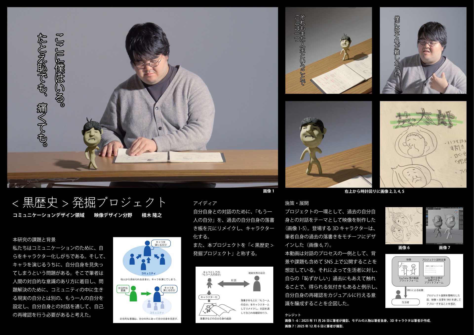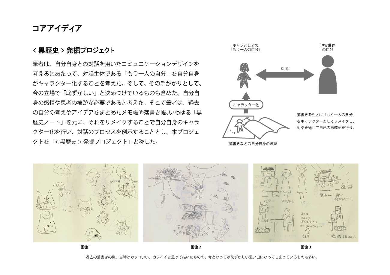 自分自身との対話のために、「もう一人の自分」を、過去の自分自身の落書き帳を元にリメイクし、キャラクター化する。また、本プロジェクトを「<黒歴史 > 発掘プロジェクト」と称する。