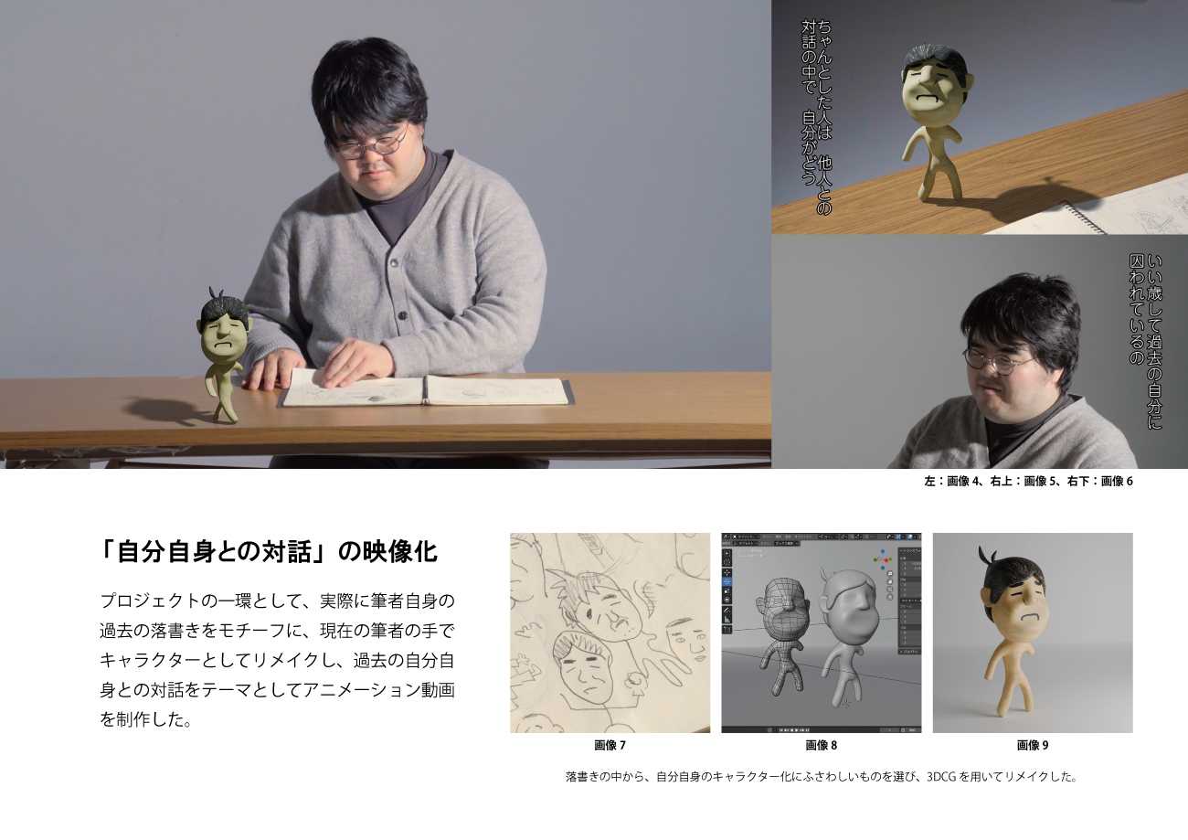 プロジェクトの一環として、過去の落書きをもとに自分自身をキャラクター化し、対話を行う様子をイメージした映像を制作した。